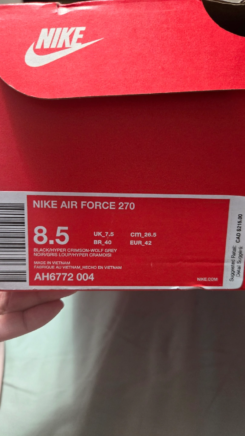 Selling a pair of Nike Air Force 270 sneakers in size US 8.5. The colourway is Black/Hyper Crimson-Wolf Grey. They are in used condition, as shown in the pictures. The box is included.