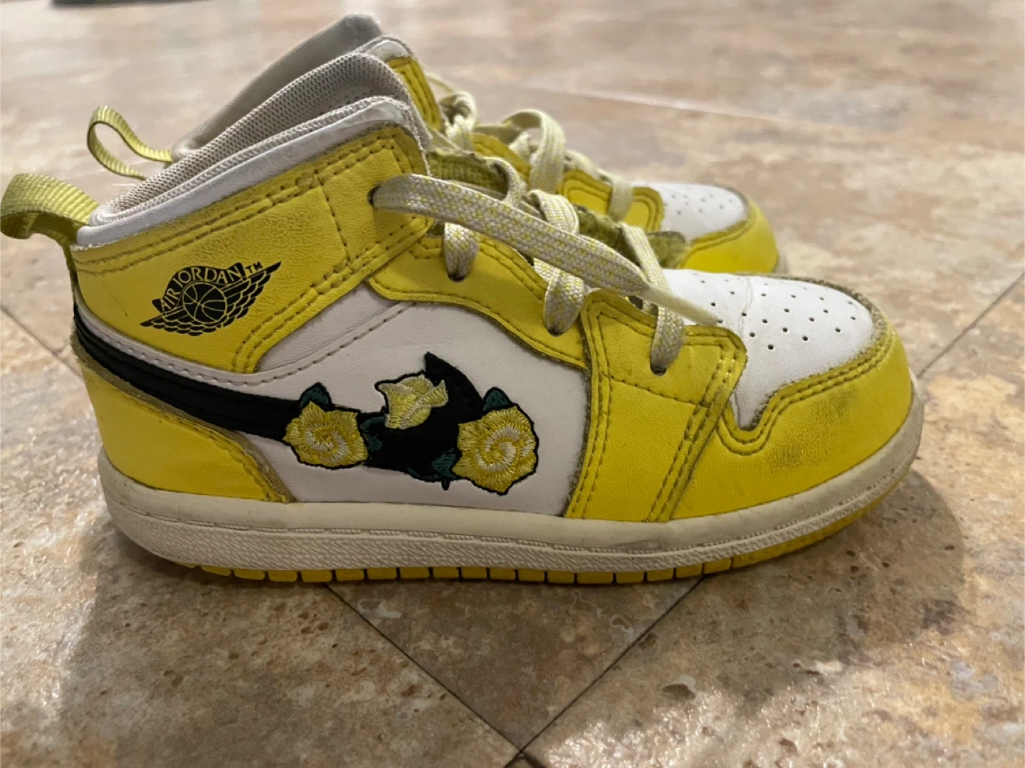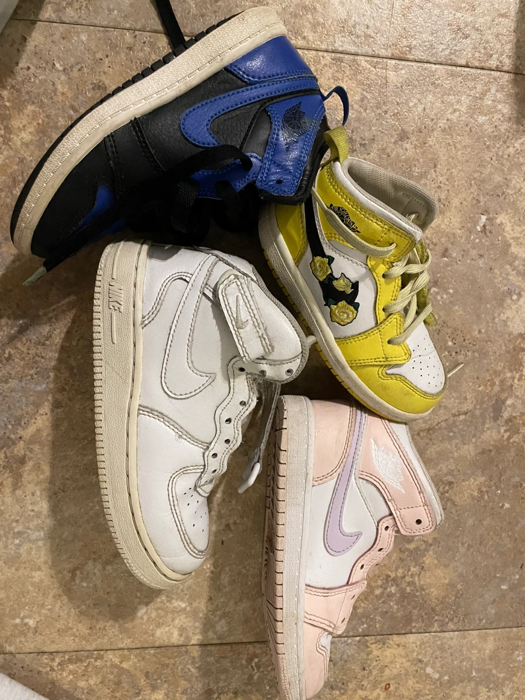 Selling a bundle of used kids' shoes. Includes Nike Air Force and Jordan models. Please see photos for condition