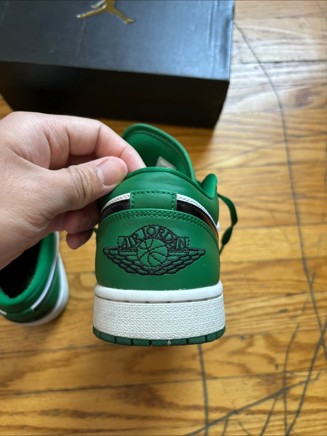 Selling a pair of Nike Air Jordan 1 Low sneakers in a fresh green, black, and white colourway! Size 8 US. These come with the original box. Perfect for adding a pop of colour to your wardrobe or for hitting the court!