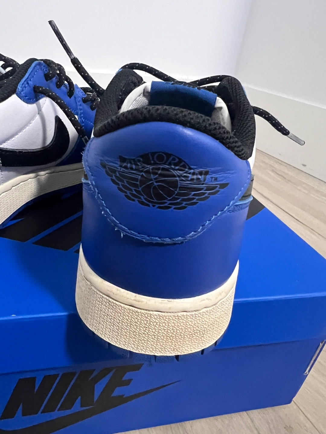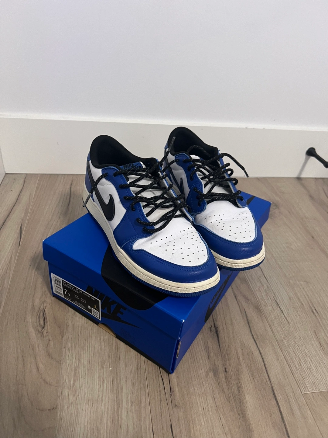 Pair of Air Jordan 1 Low SE sneakers. Blue, white, and black colourway. Size 7Y. Comes with original box.