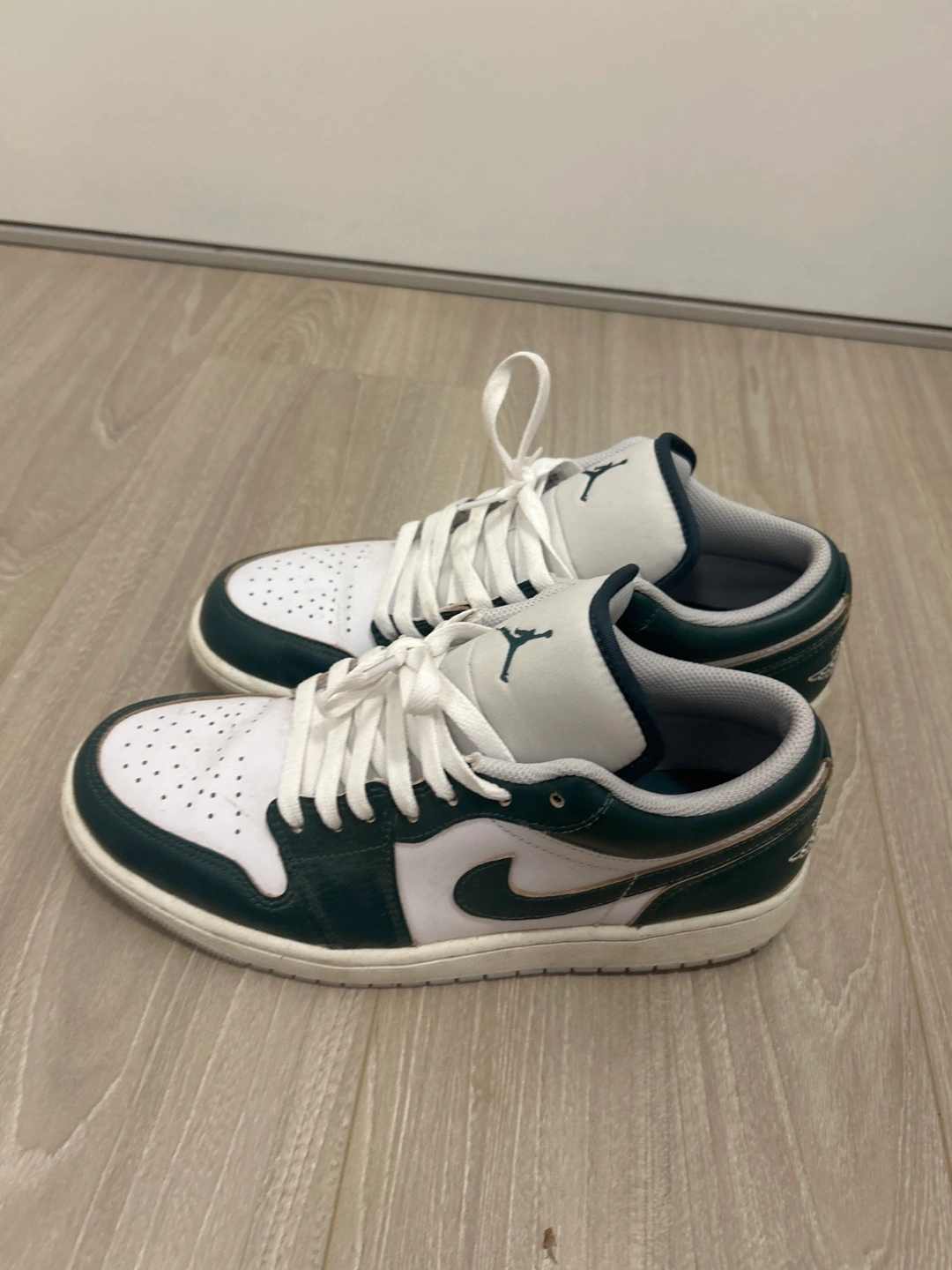 Selling a pair of Nike Air Jordan 1 Low sneakers in a white and green colourway. They're in great shape and ready for a new home!