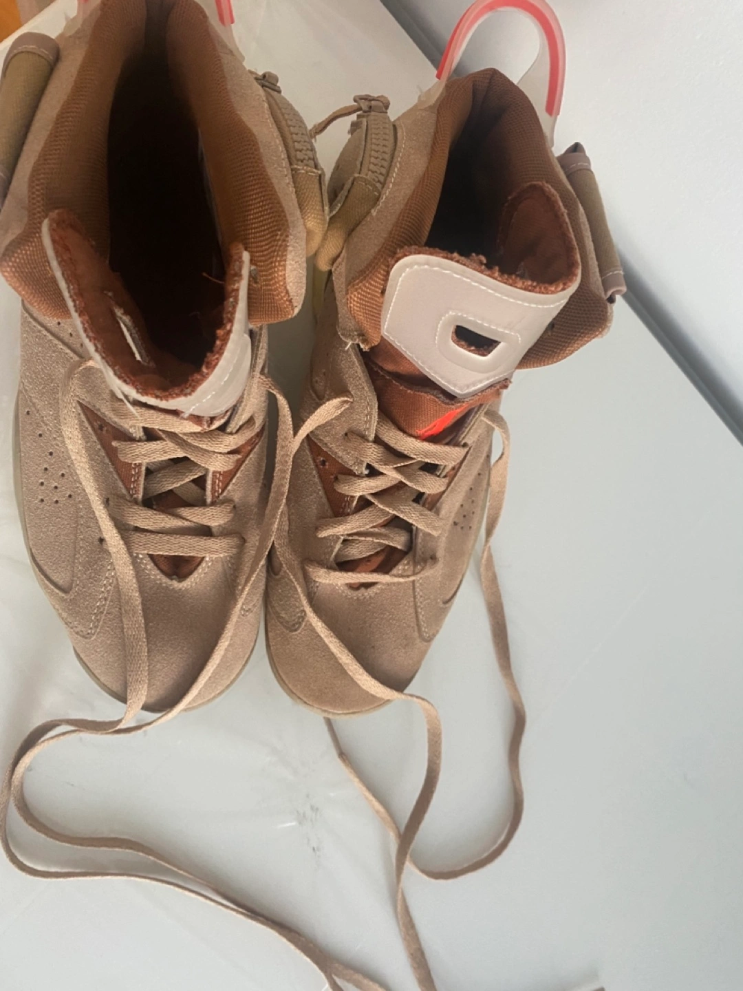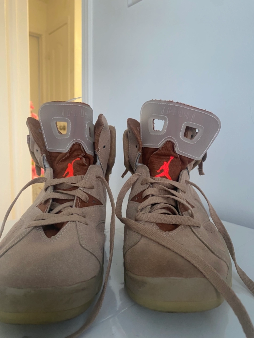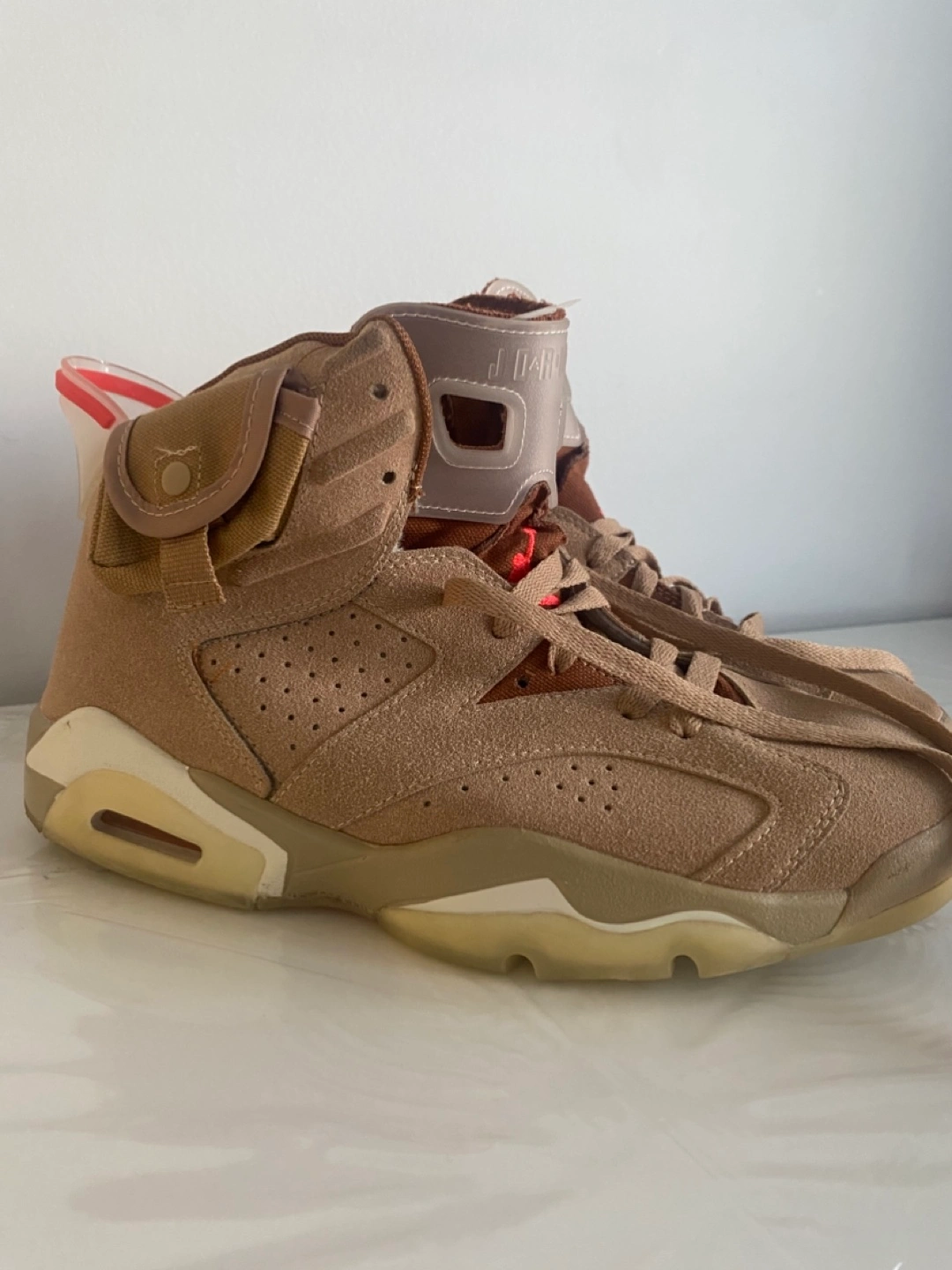 Selling a pair of Nike Air Jordan 6 Travis Scott sneakers. These are in good condition and ready for a new home! They feature a unique design and are perfect for any sneaker enthusiast