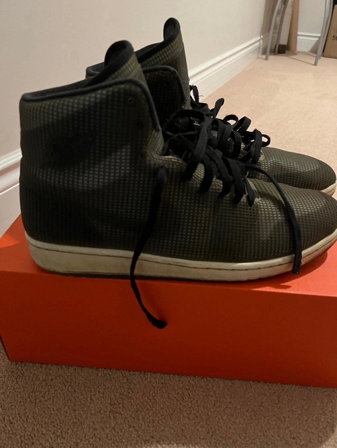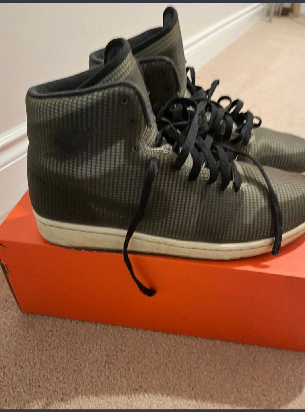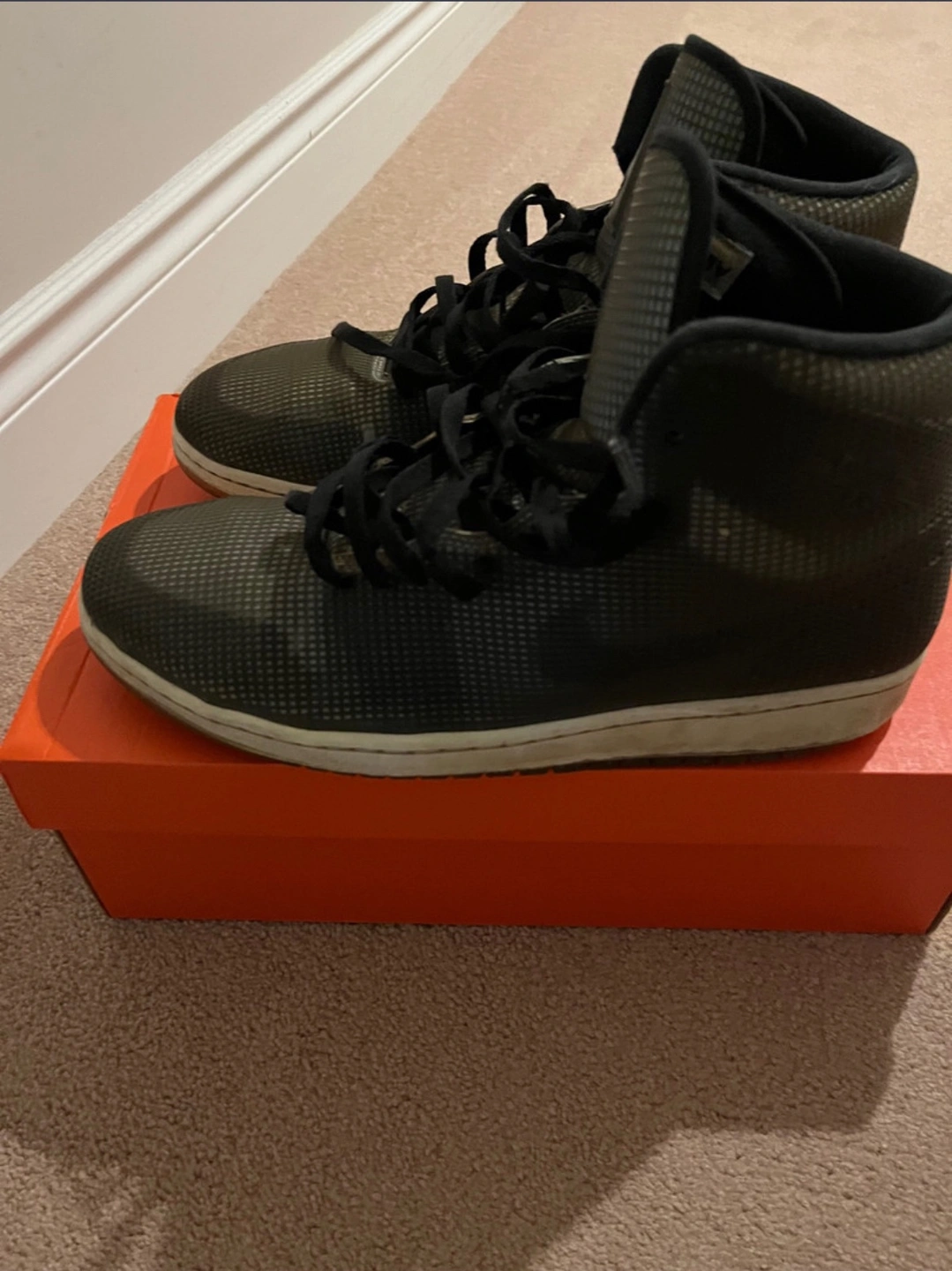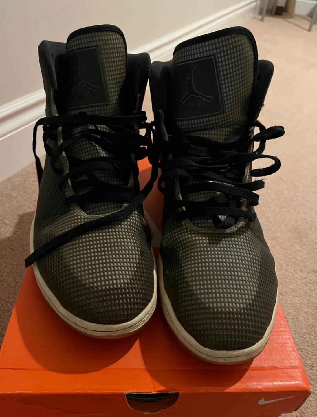 Men's size 13 sneakers. They are black and grey with a white sole.
