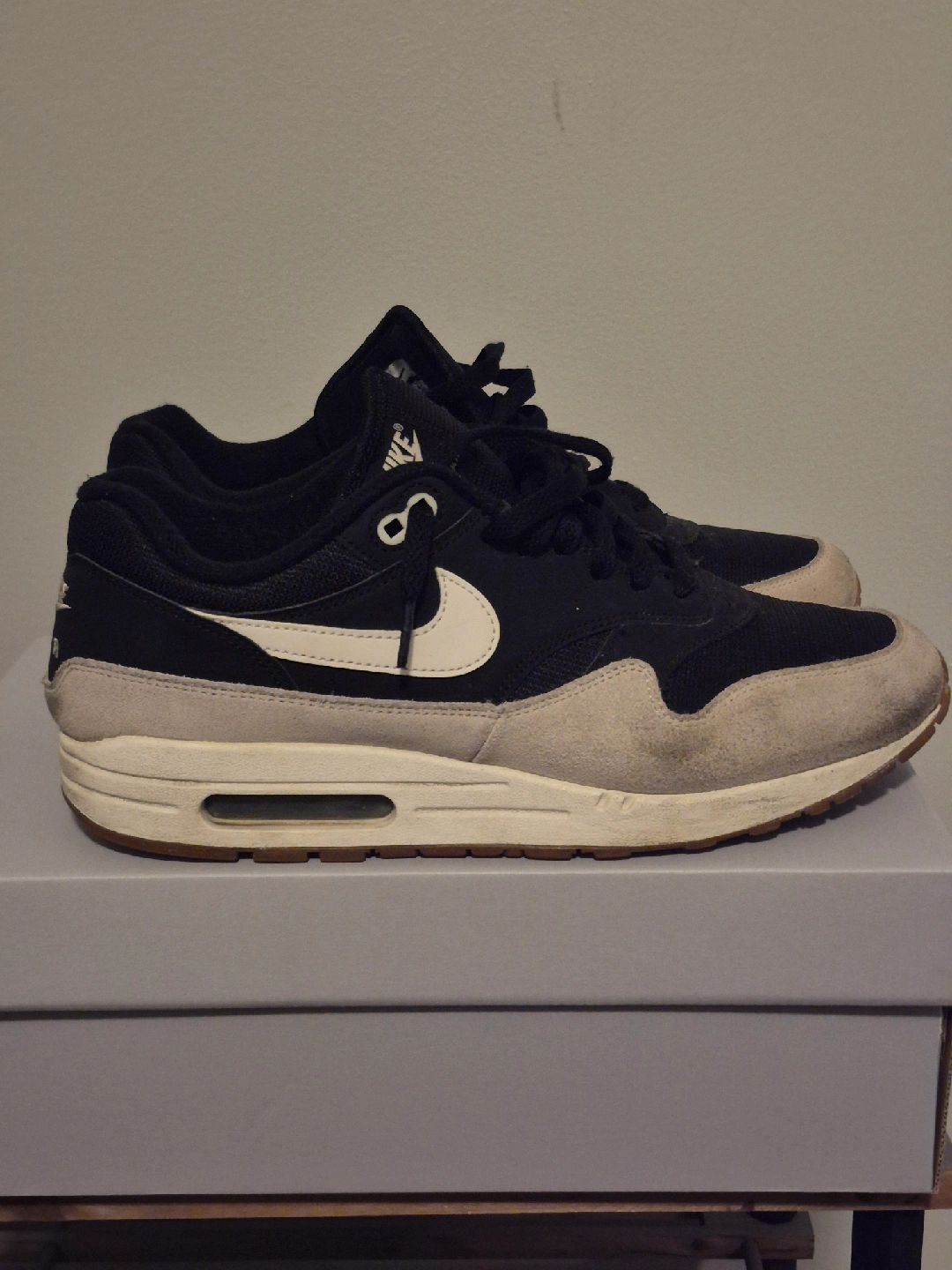 Selling a pair of Nike Air Max 1 sneakers in a classic black and white colourway. They're in used condition, as you can see from the photos.