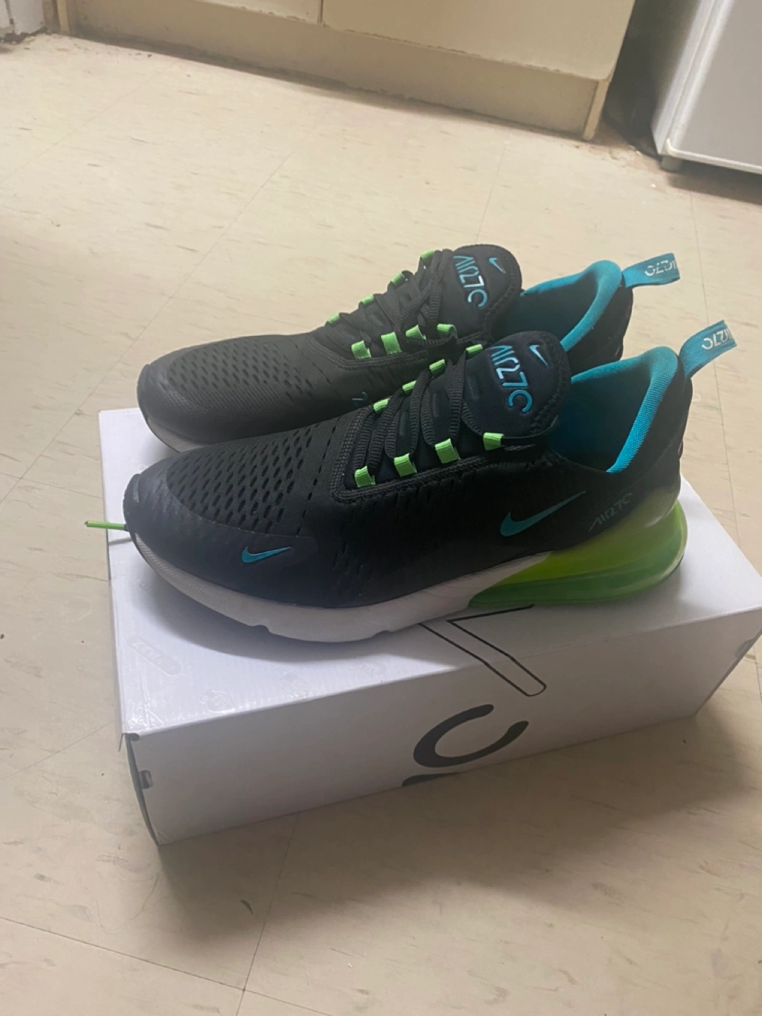 Black, blue, and green running shoes. Comes with box. Size 46 - 12