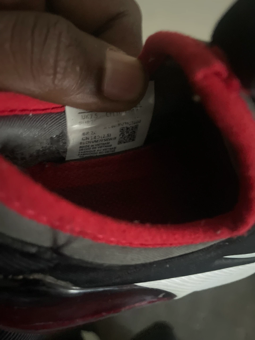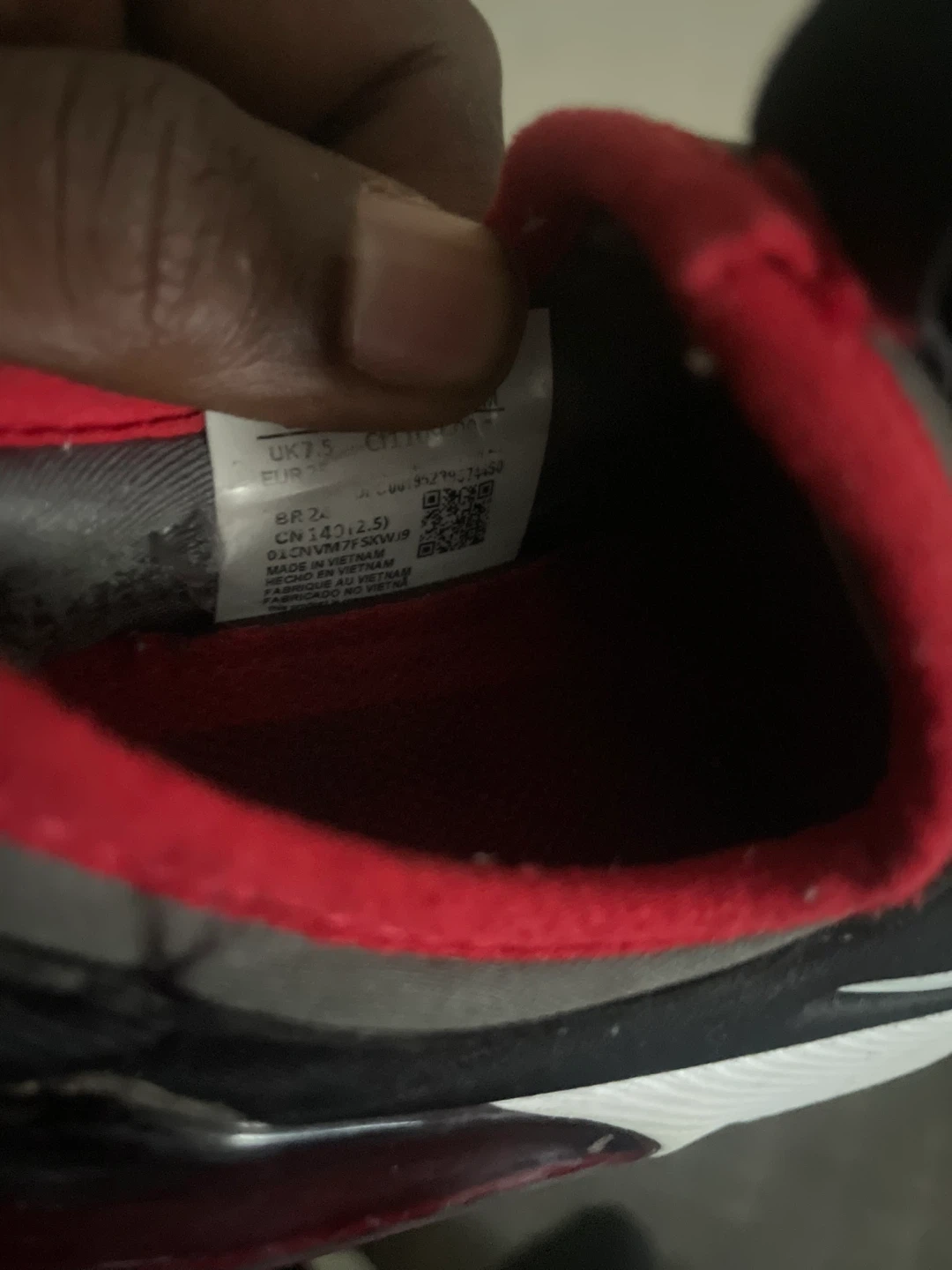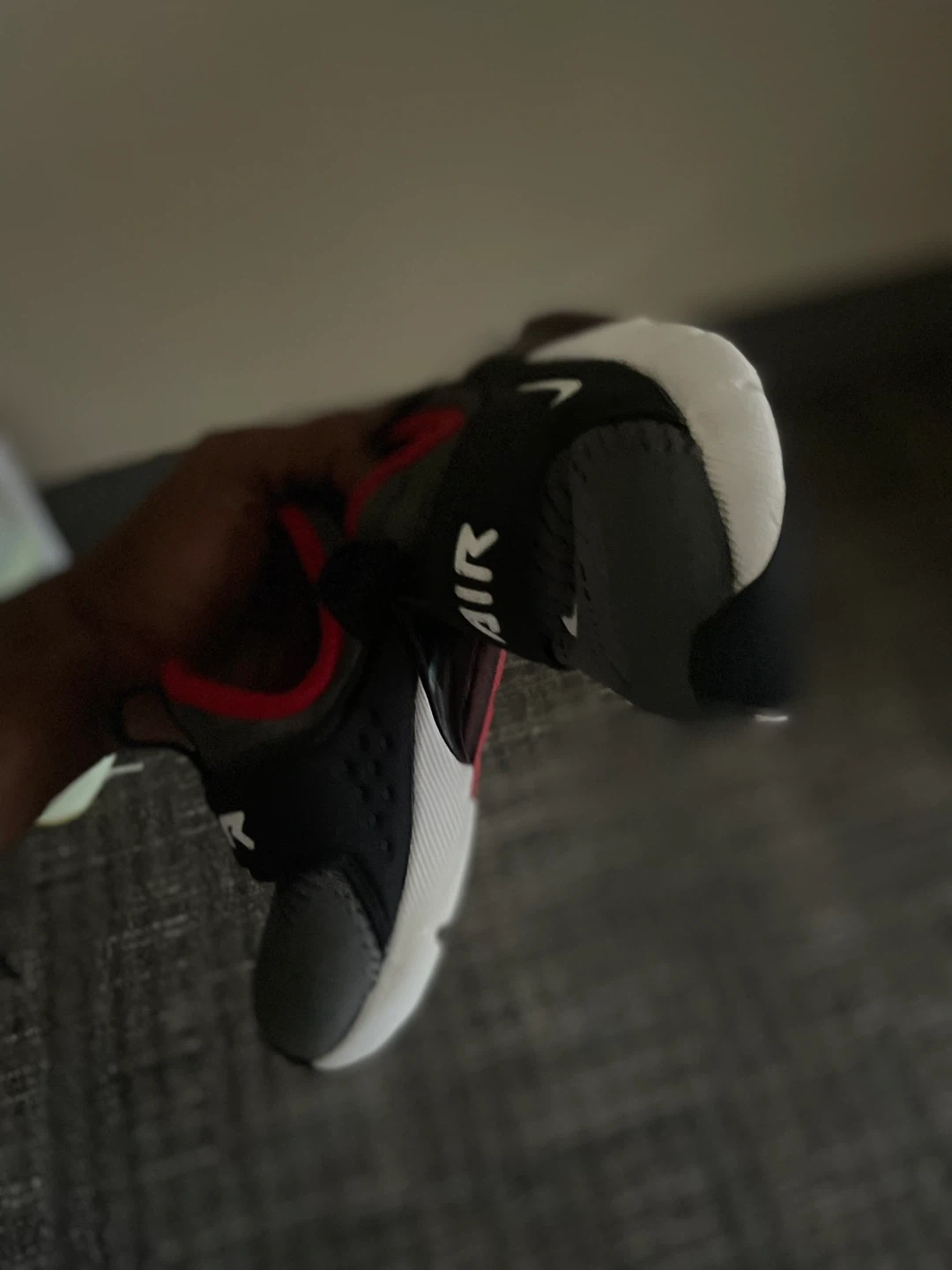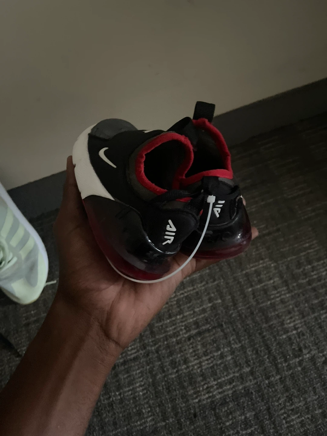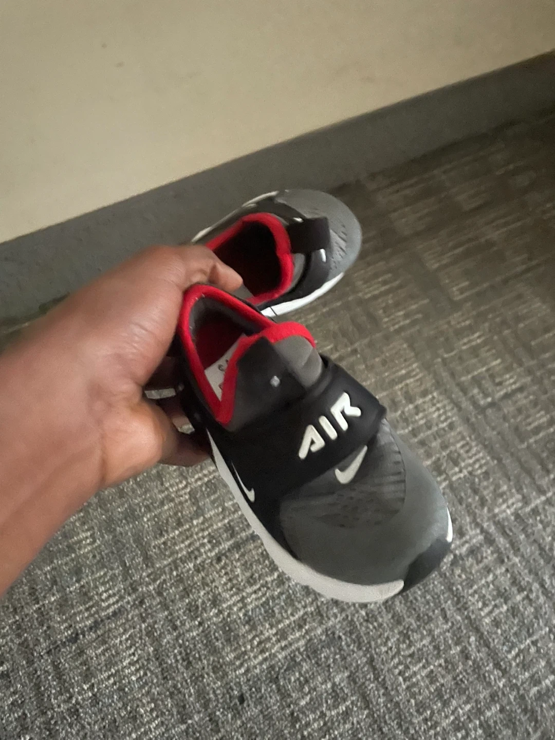 Selling a pair of Nike Air Max 270 Go Easy On/Off shoes for kids. They are in great condition and ready for a new home! The size is 2.5 BR (which is equivalent to 140(2.5) CN). They feature a black and grey design with red accents, and the word "AIR" is prominently displayed on the side