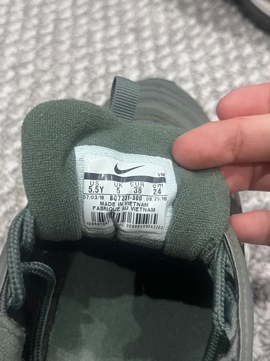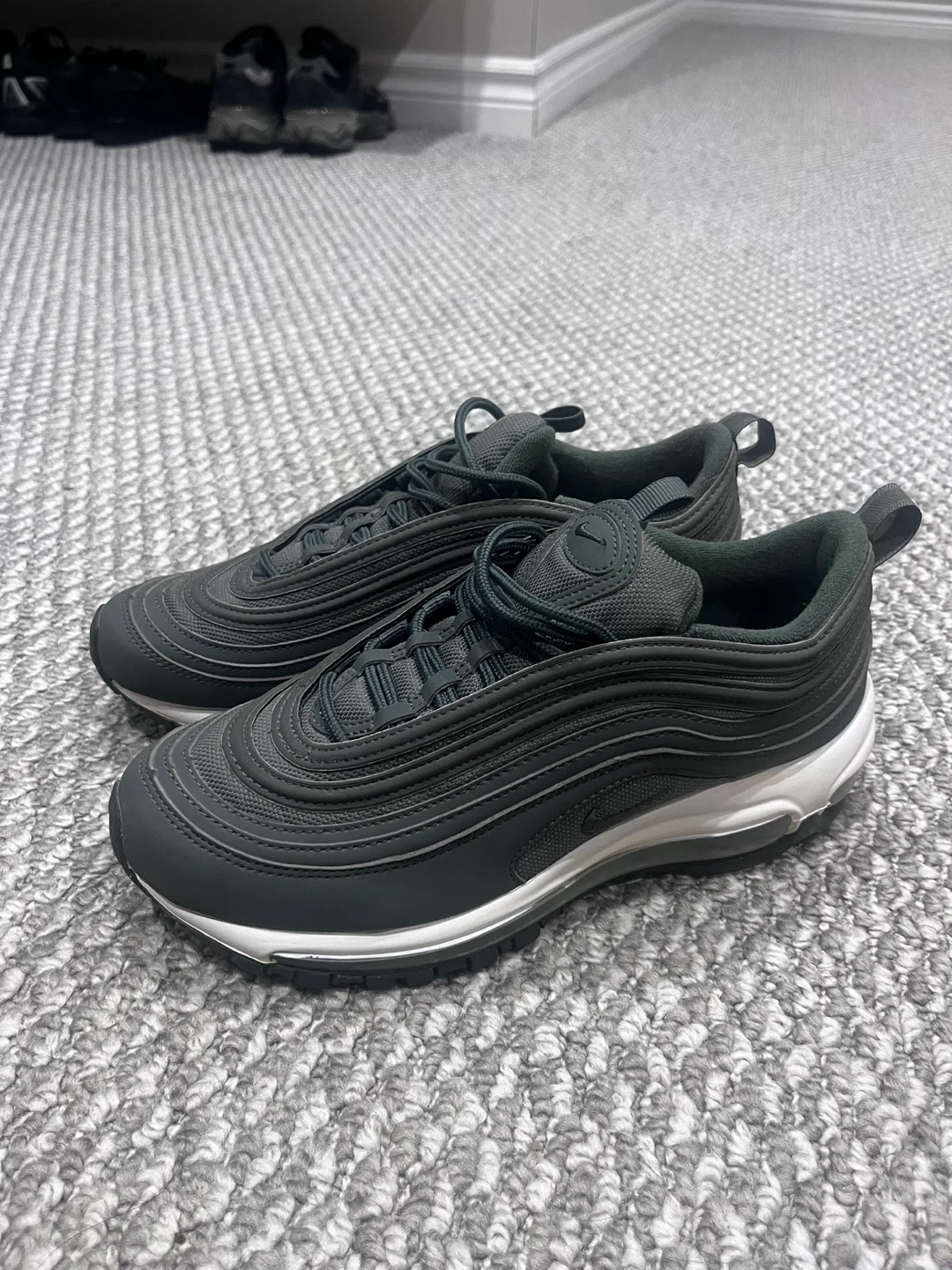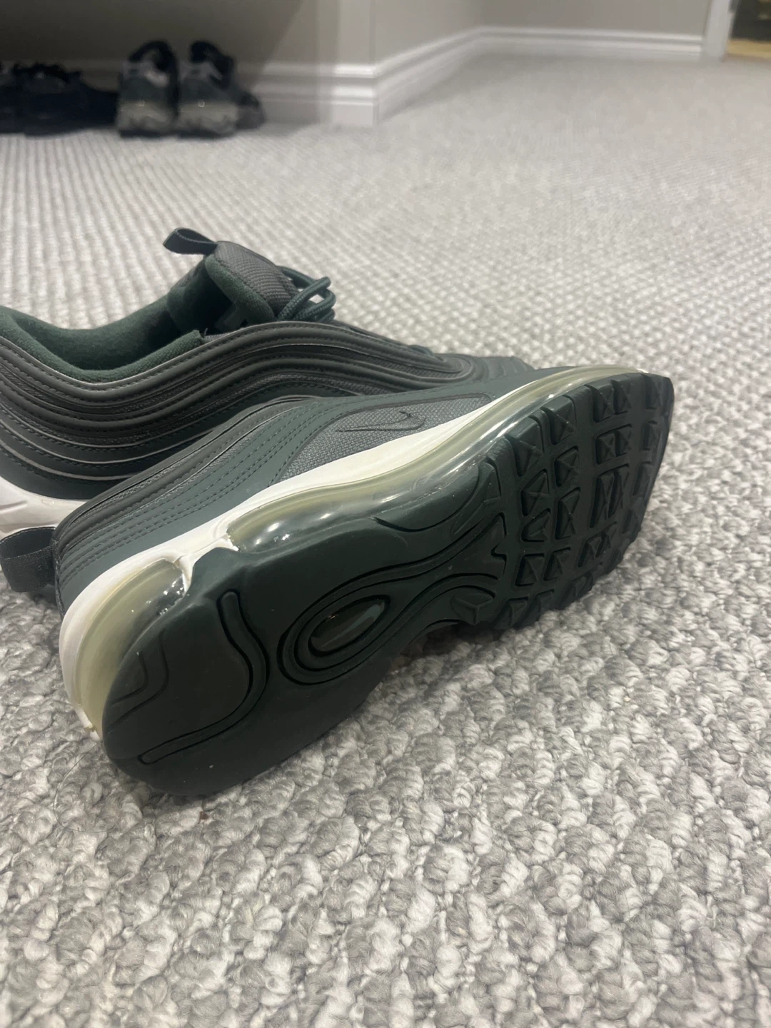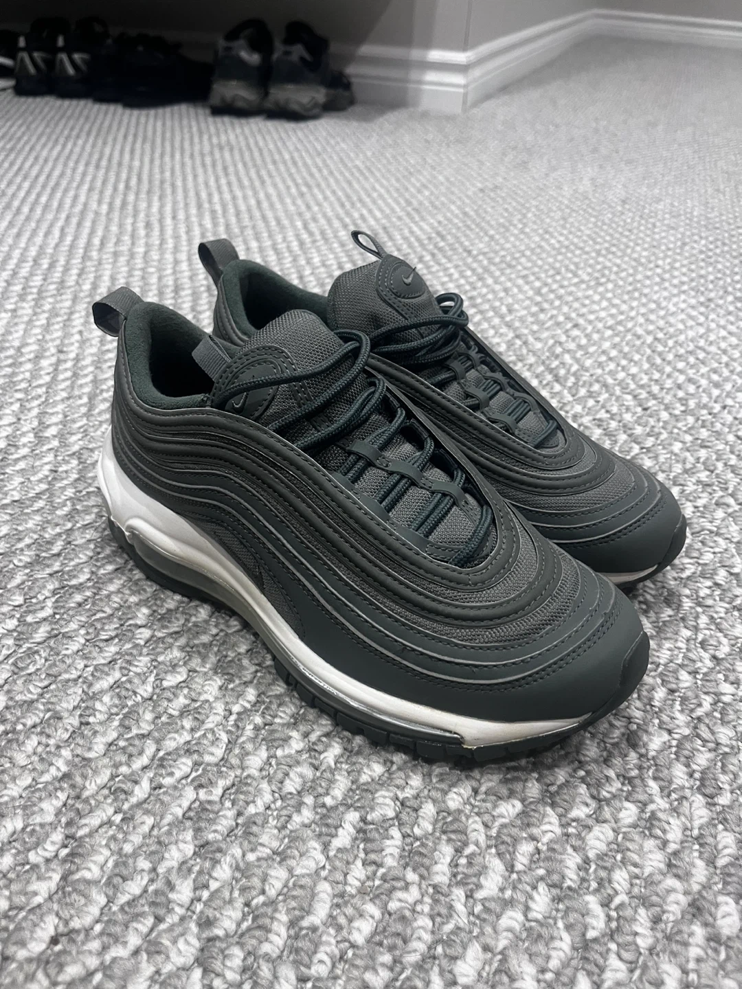 Selling a pair of Nike Air Max 97 in olive green. The size is 5.5Y. They're in perfect condition!!