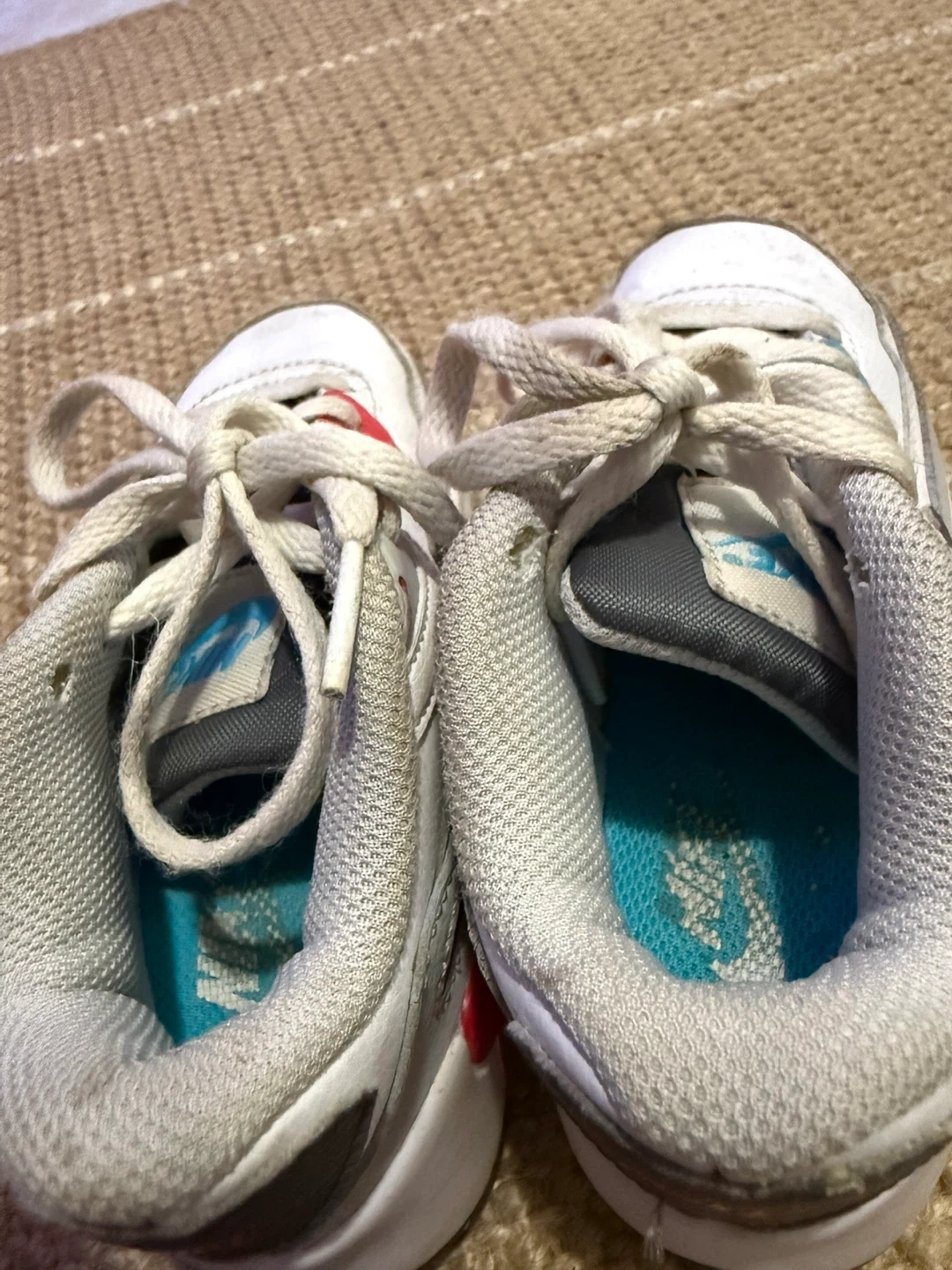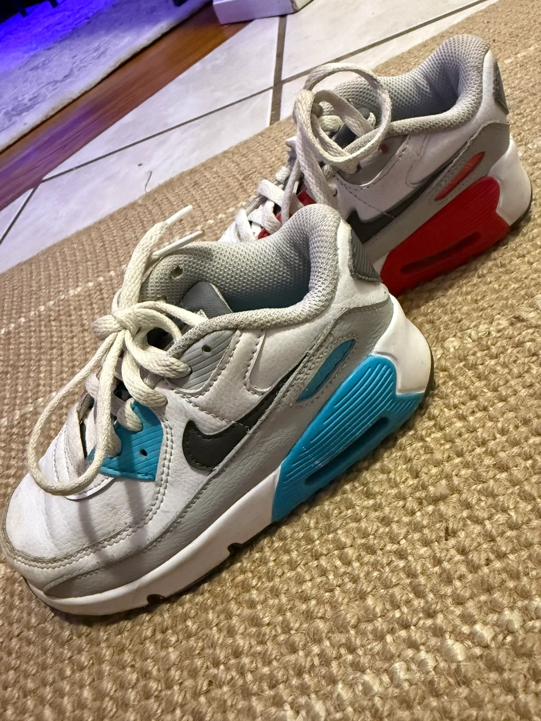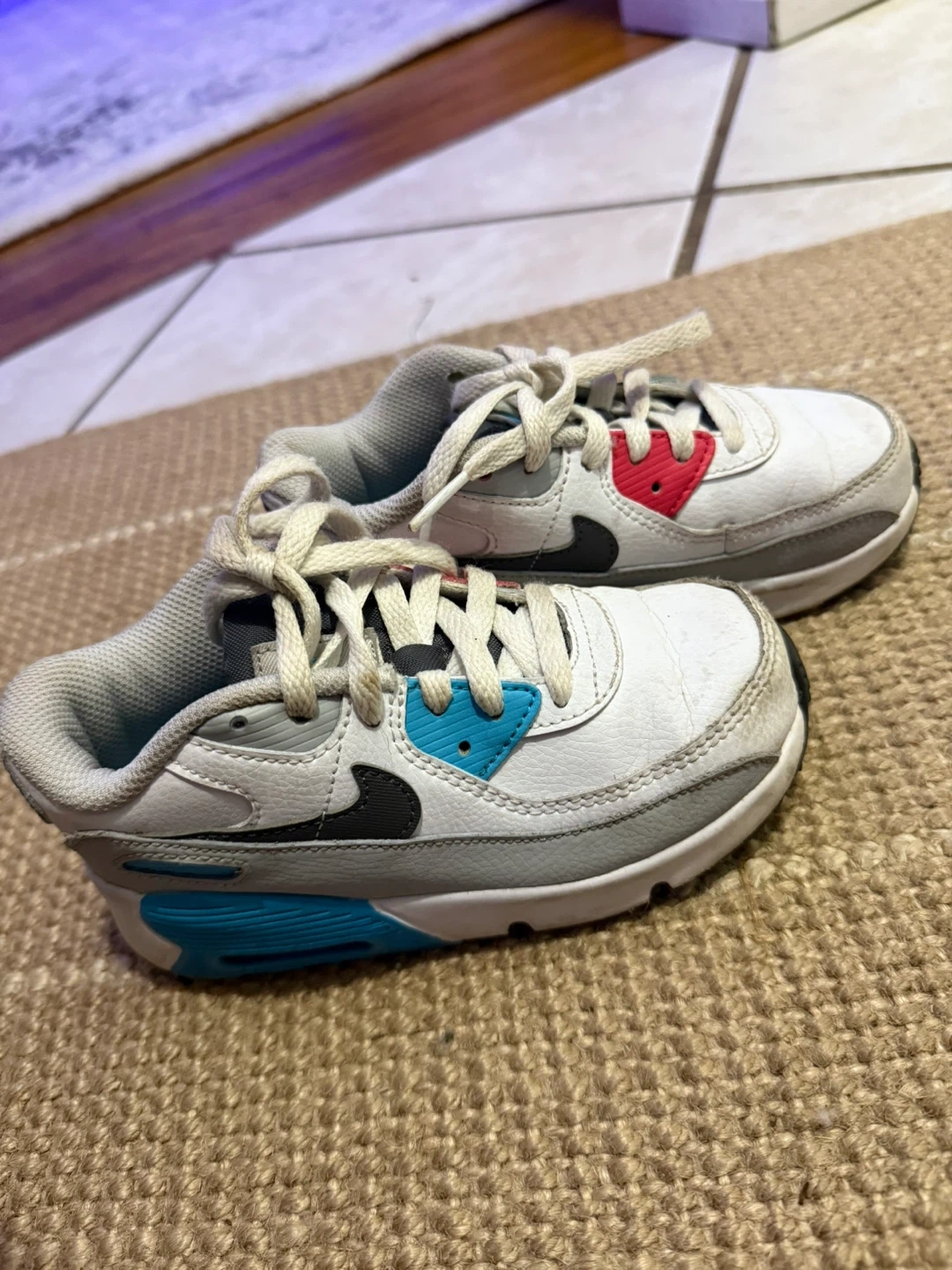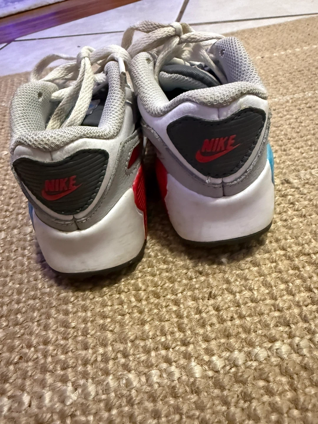 Selling a pair of toddler Nike Air Max in size 10. They're white with grey and pops of red and blue. Used good!