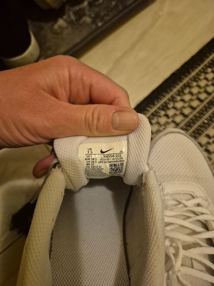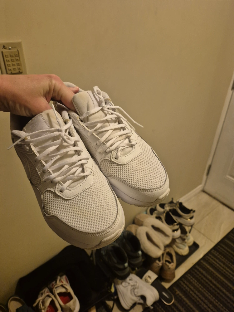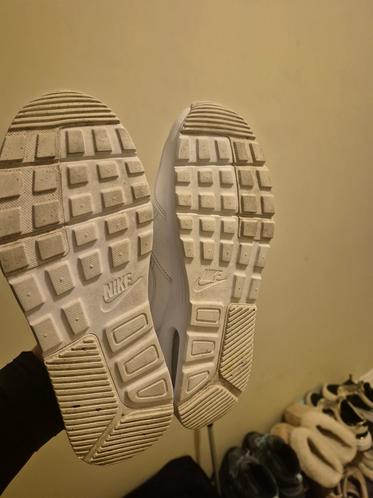 Selling a pair of Nike Air Max sneakers in size 7.5. They're white and have a classic look. The soles show some wear, but they're still in good condition for everyday use