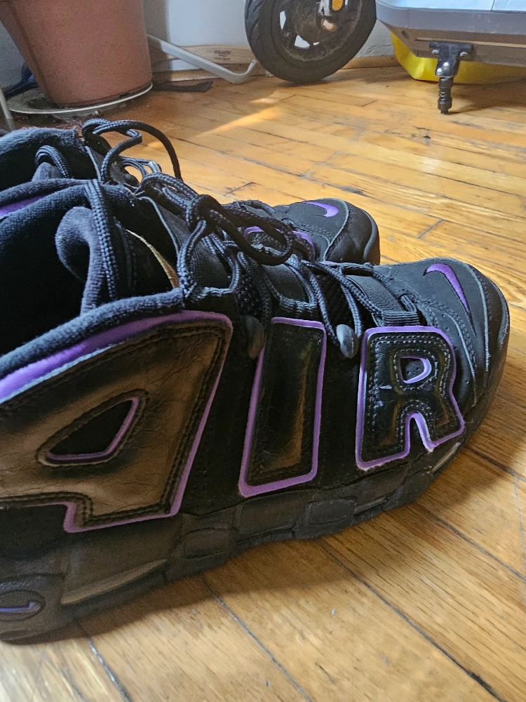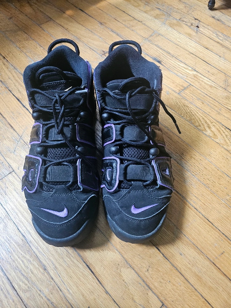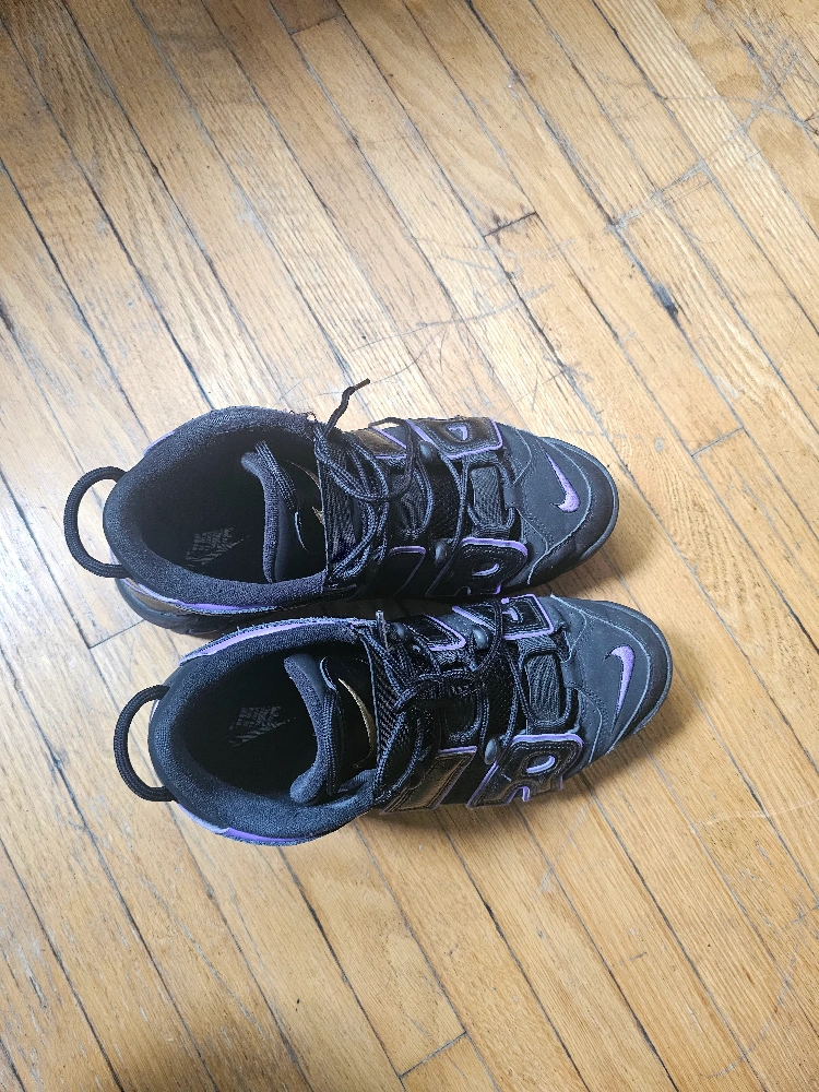 Classic Nike basketball shoes. Black & Purple colourway. Lace-up closure. Features visible Air cushioning.These shoes are super stylish and comfortable, perfect for everyday wear or hitting the court.
