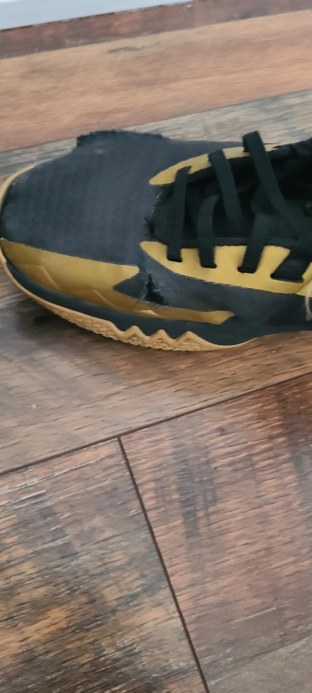 Selling a pair of black and gold Nike basketball shoes. They have some wear and tear, as you can see in the pictures. Still have lots of life left for casual use or practice!