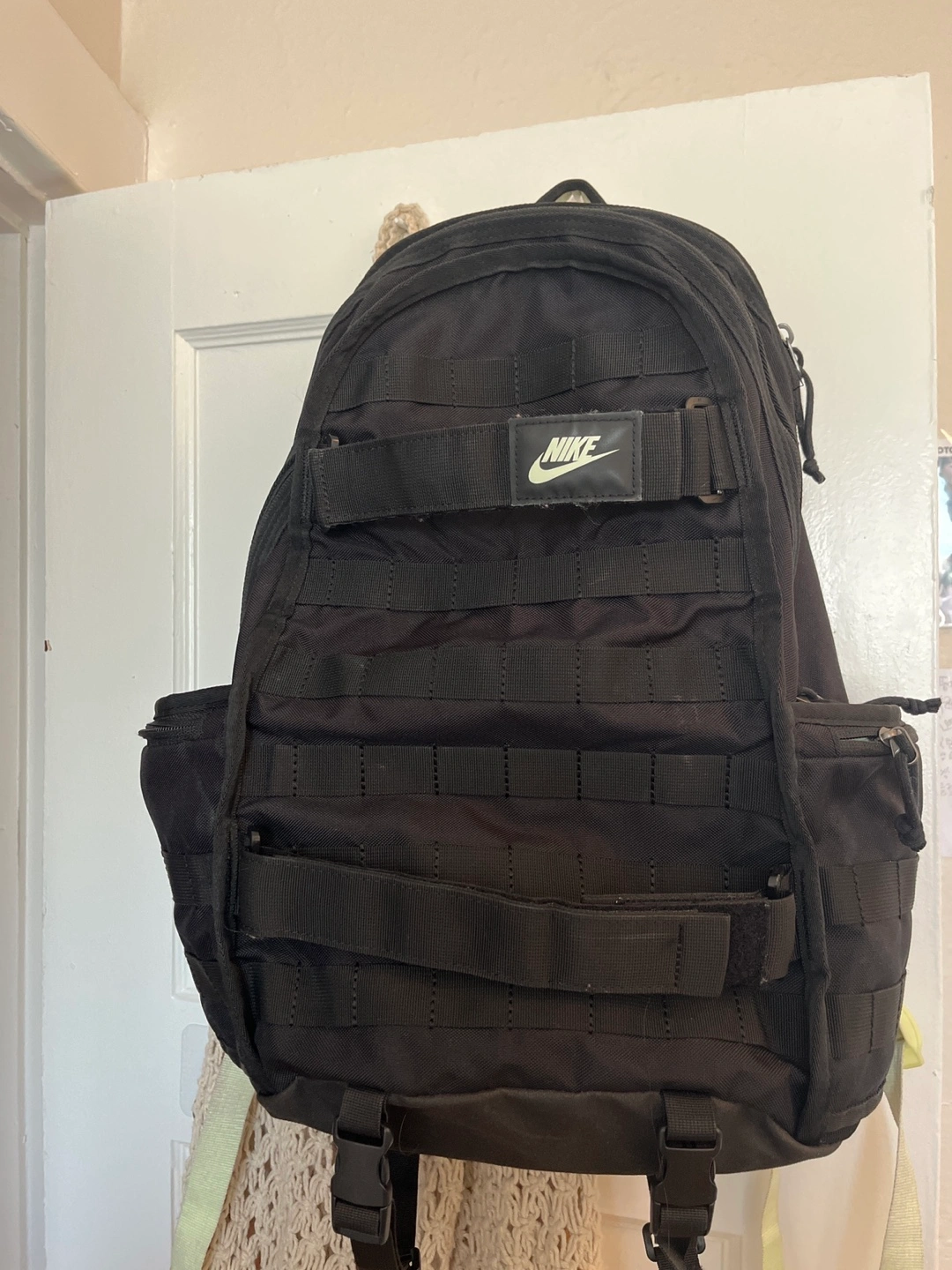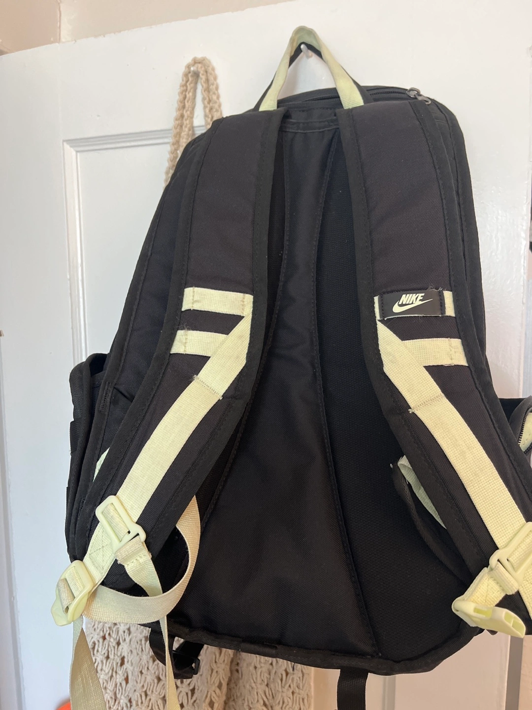 Large black Nike backpack. Multiple pockets and compartments. Adjustable straps. Great for school or everyday use.