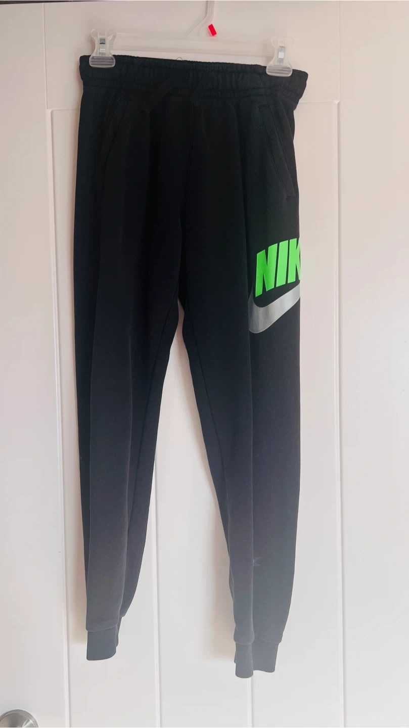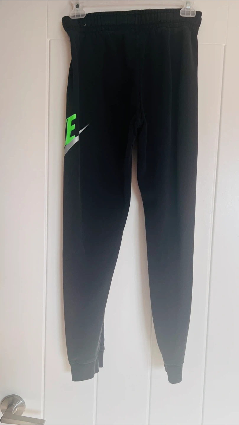 Selling a black Nike sweatpants! They're in great shape and ready for a new home. The Nike logo is a stylish green colour. Perfect for lounging or working out!
