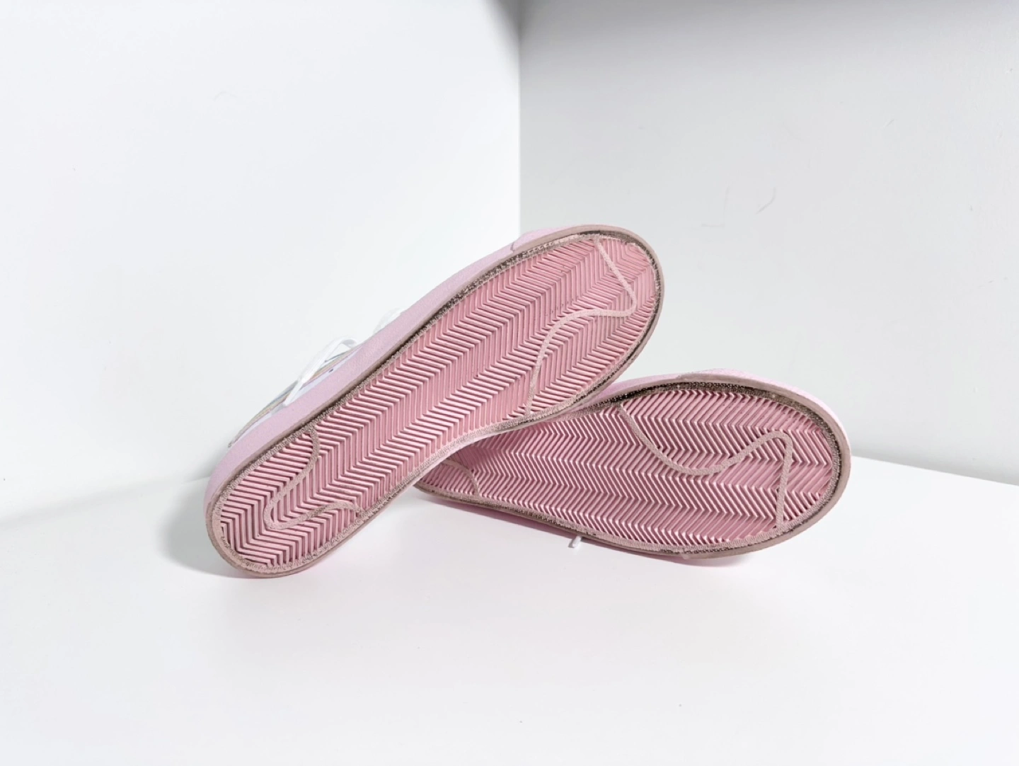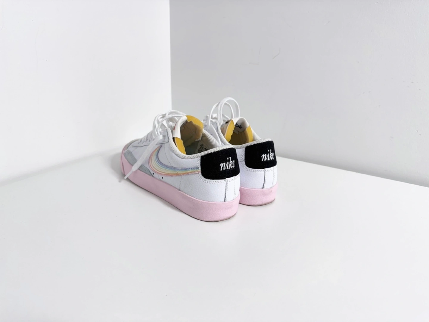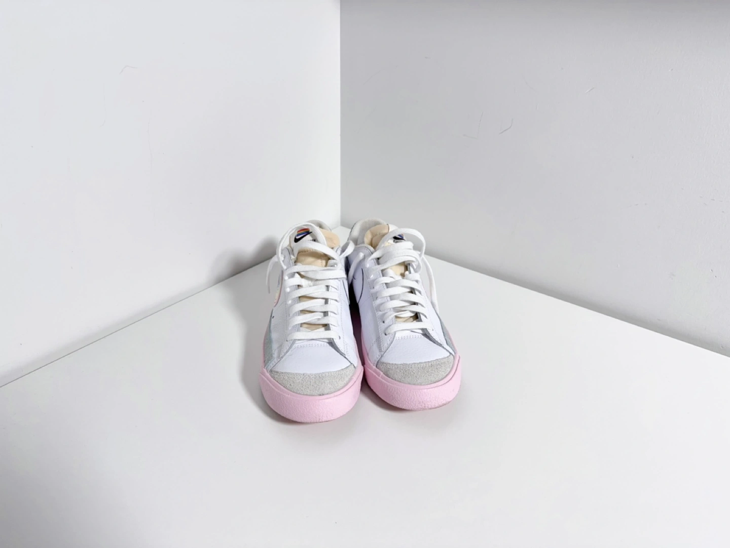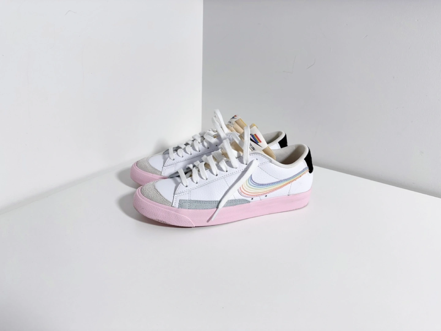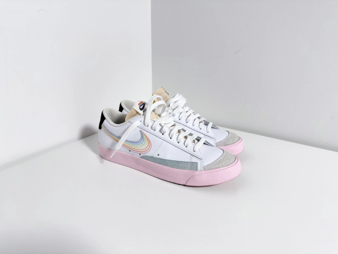 Men’s Nike Blazer Low '77 Betrue sneakers. White leather upper, rainbow swoosh, pink sole. I’ve only worn them once, excellent condition.