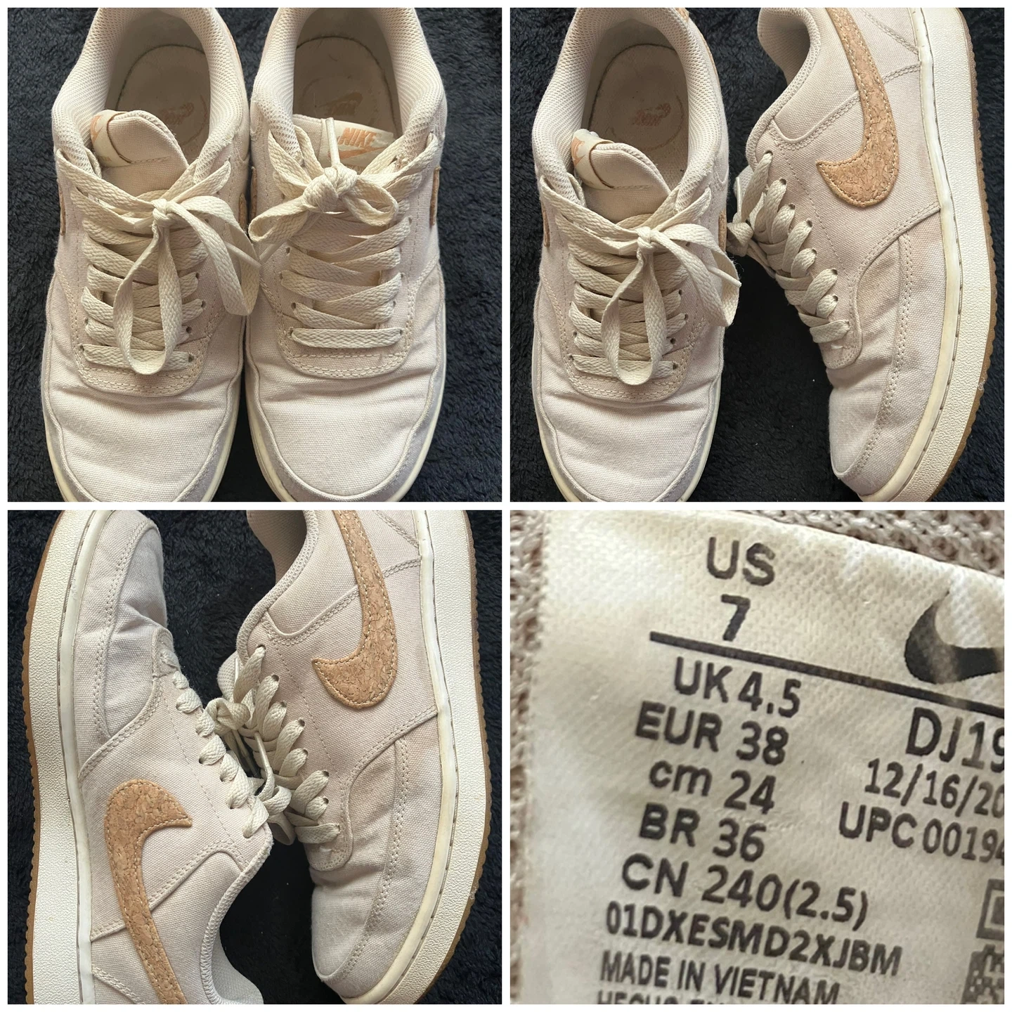 Hi, I am selling a pair of Nike Court Vision Low sneakers in women's size 7. These are in good condition and feature a stylish design with a cork-like swoosh detail. Pick up only. (In Scarborough.) Thank you for your interest!