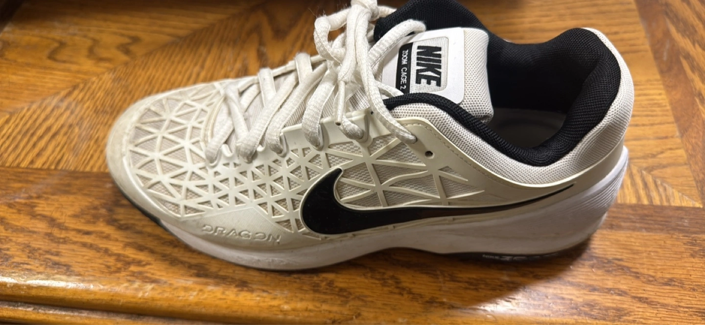 Pre-owned Nike Dragonfly tennis shoes. Off-white colour with black accents. Junior's sizing. Good for the court. US 9.5