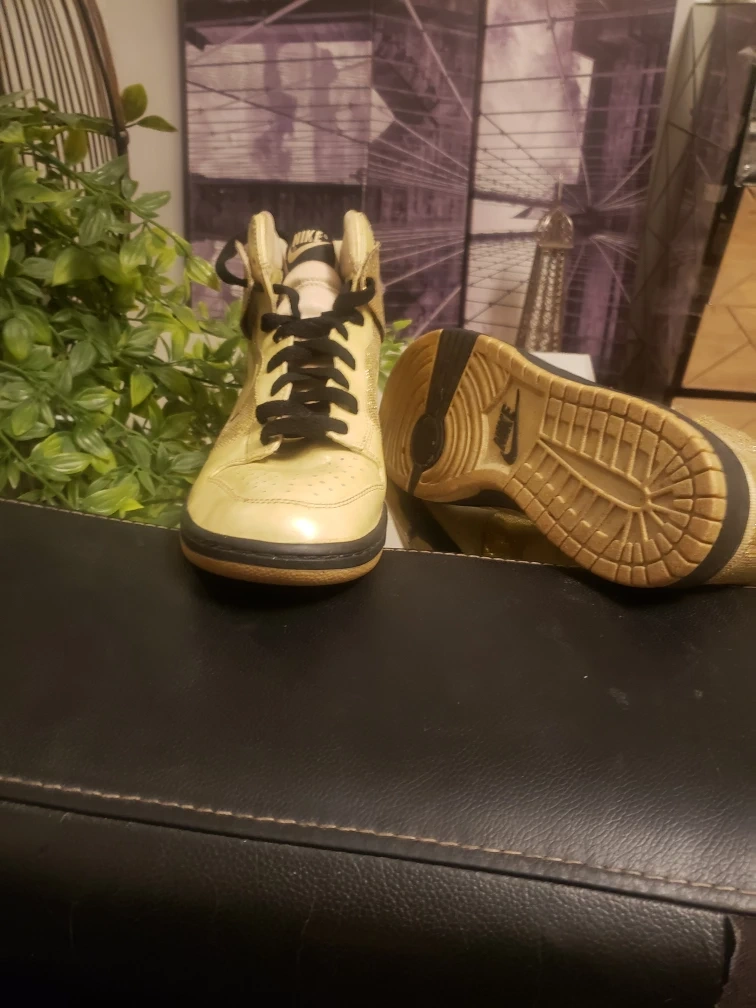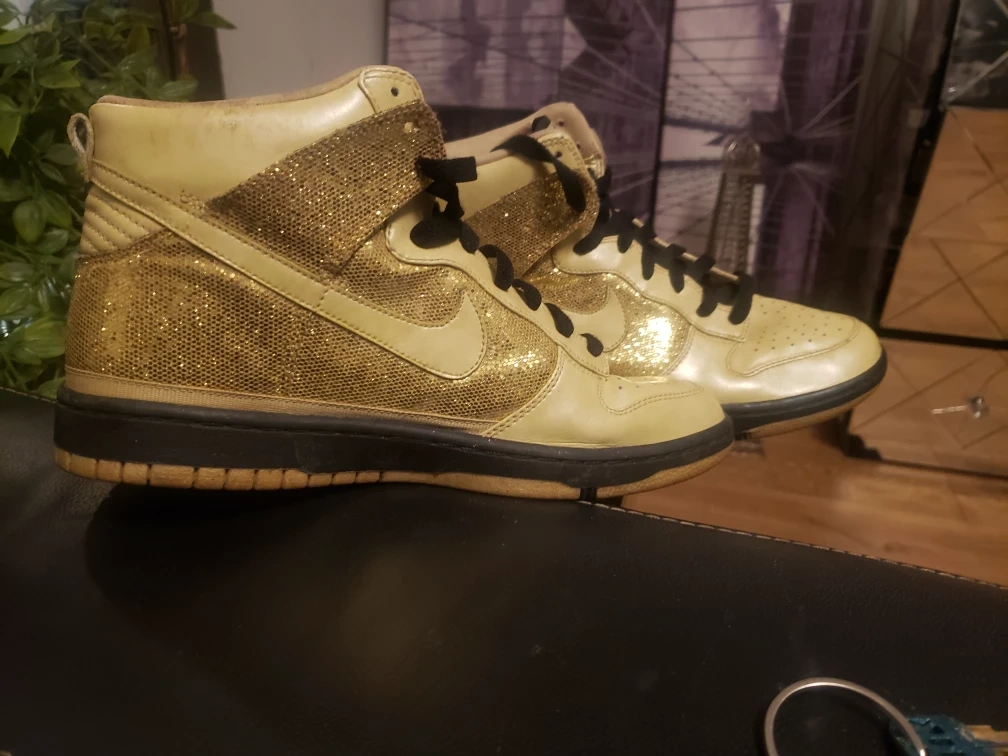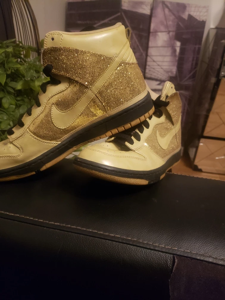 Selling a pair of Nike Dunk High sneakers in a unique gold glitter finish! These are sure to make a statement.. Great for adding some sparkle to your wardrobe!