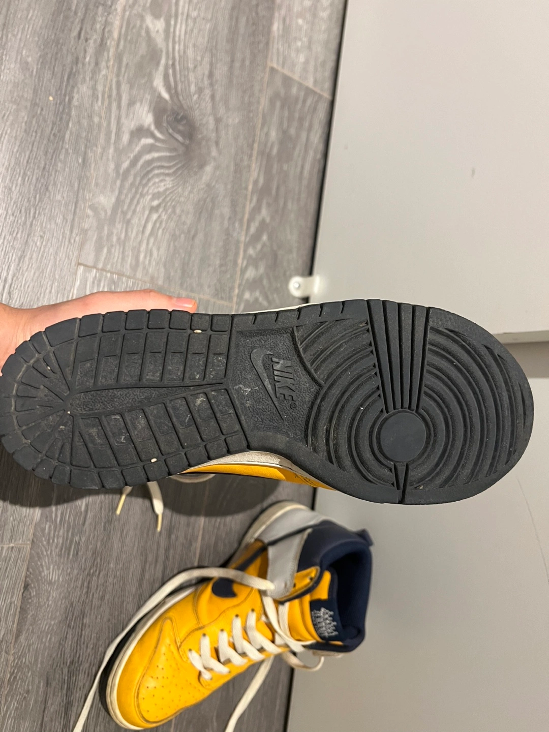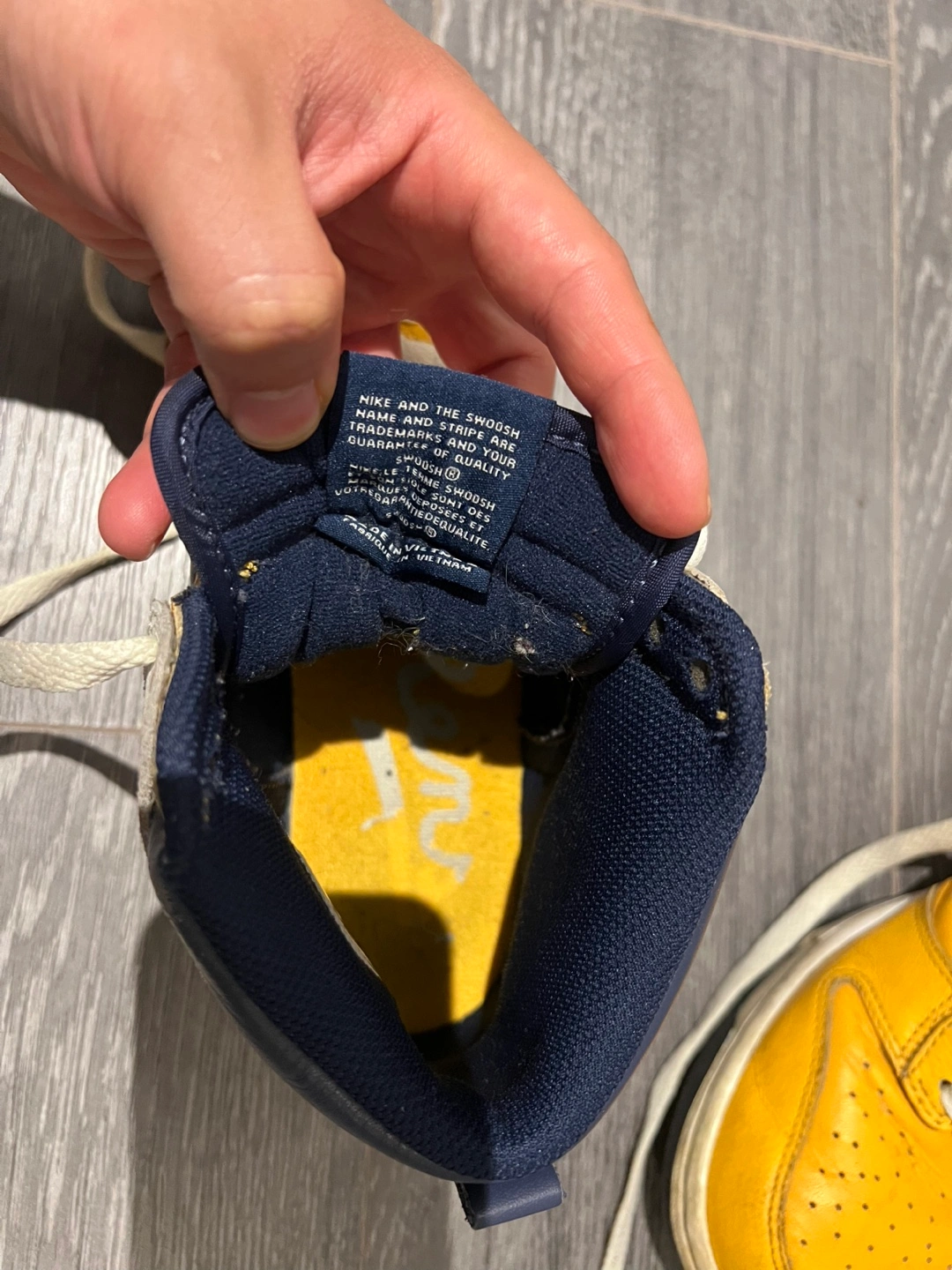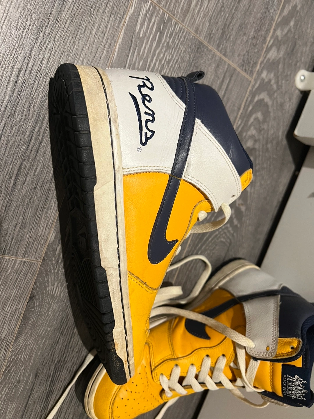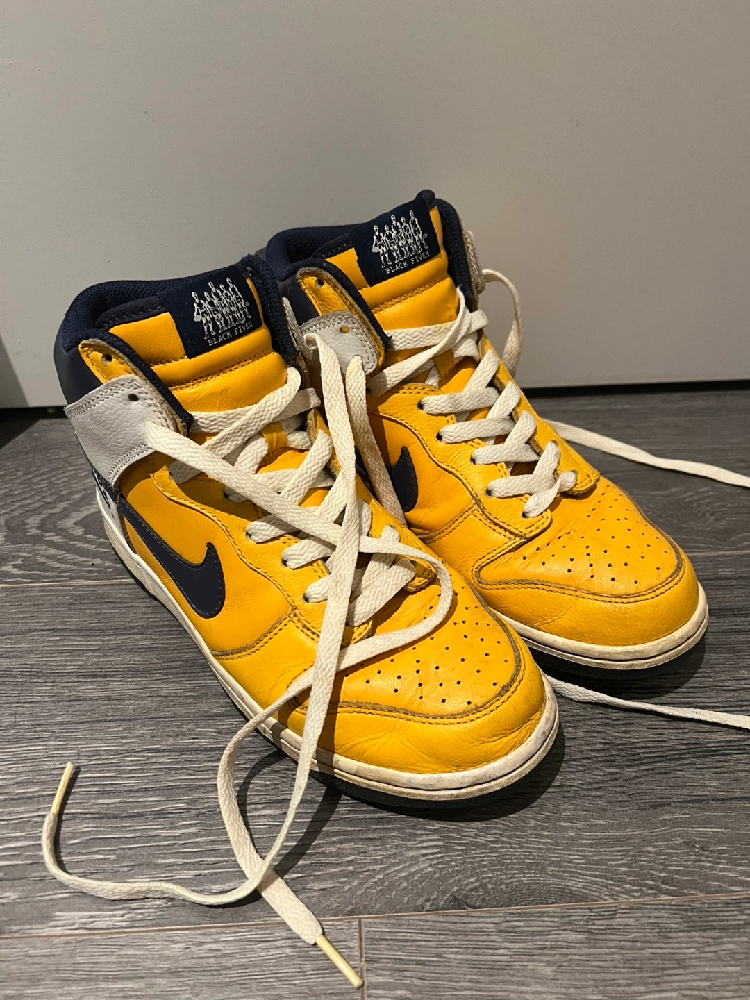 Selling a pair of Nike Dunk High sneakers in yellow, white, and navy. These are a size 6 US. They show some signs of wear but are still in good condition! RENS BLACK FIVES