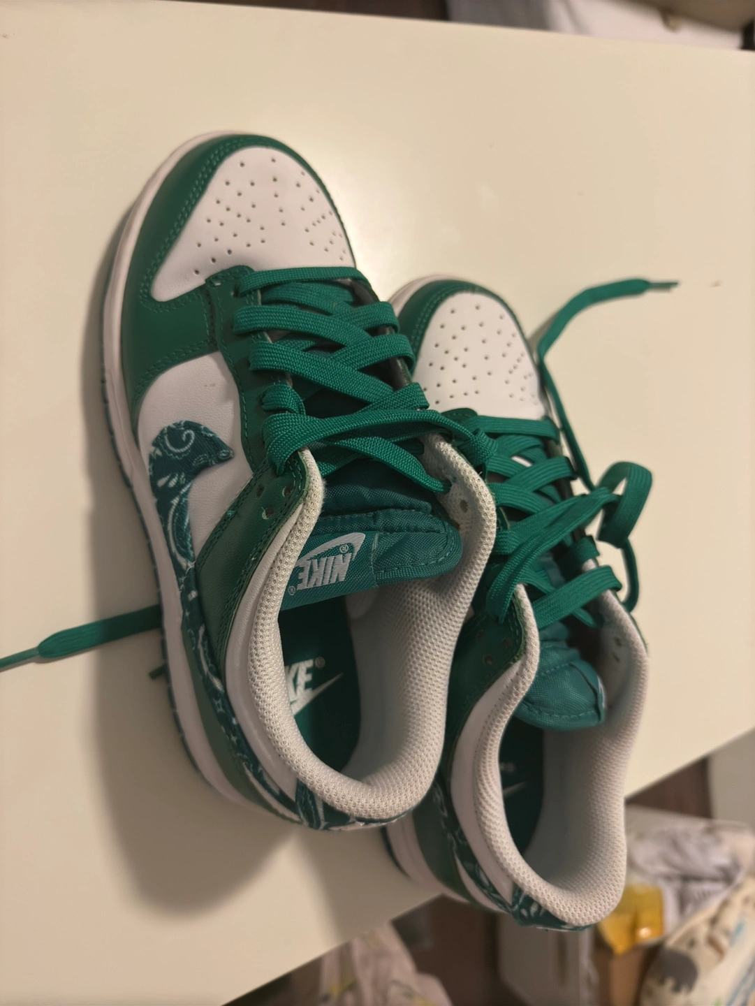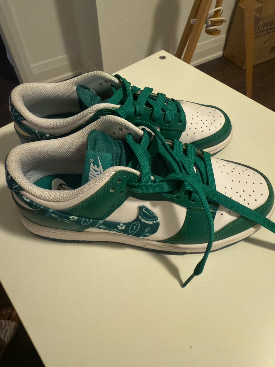Nike Green and white low-top dunks with paisley pattern on the side. Worn 2 times only