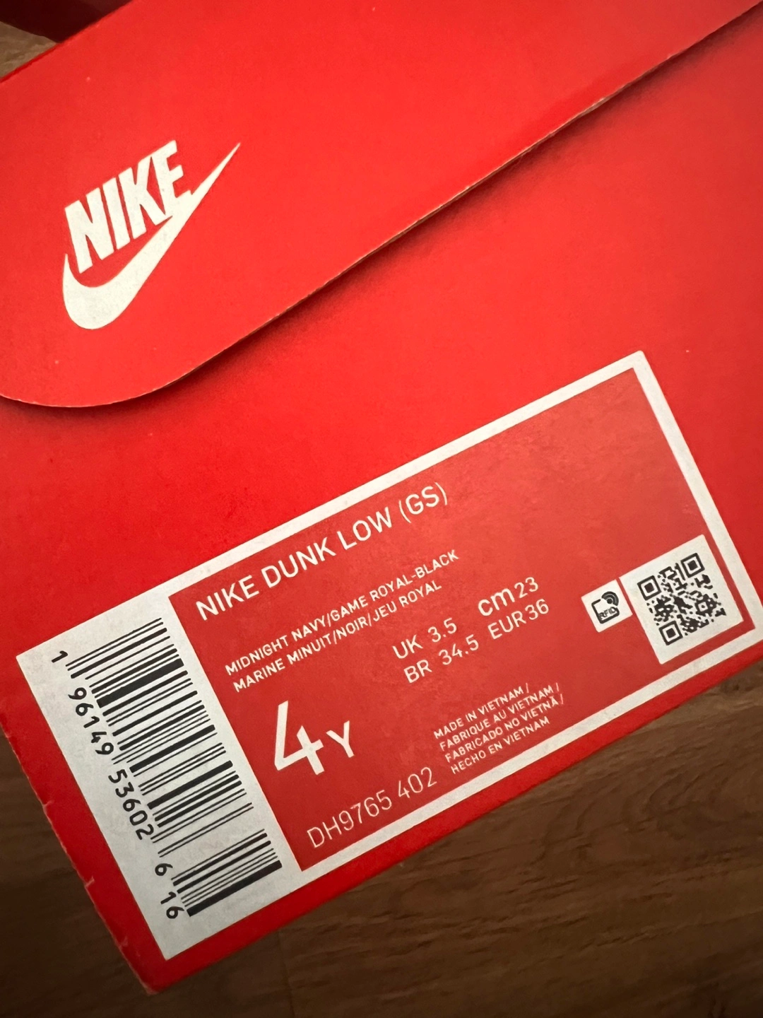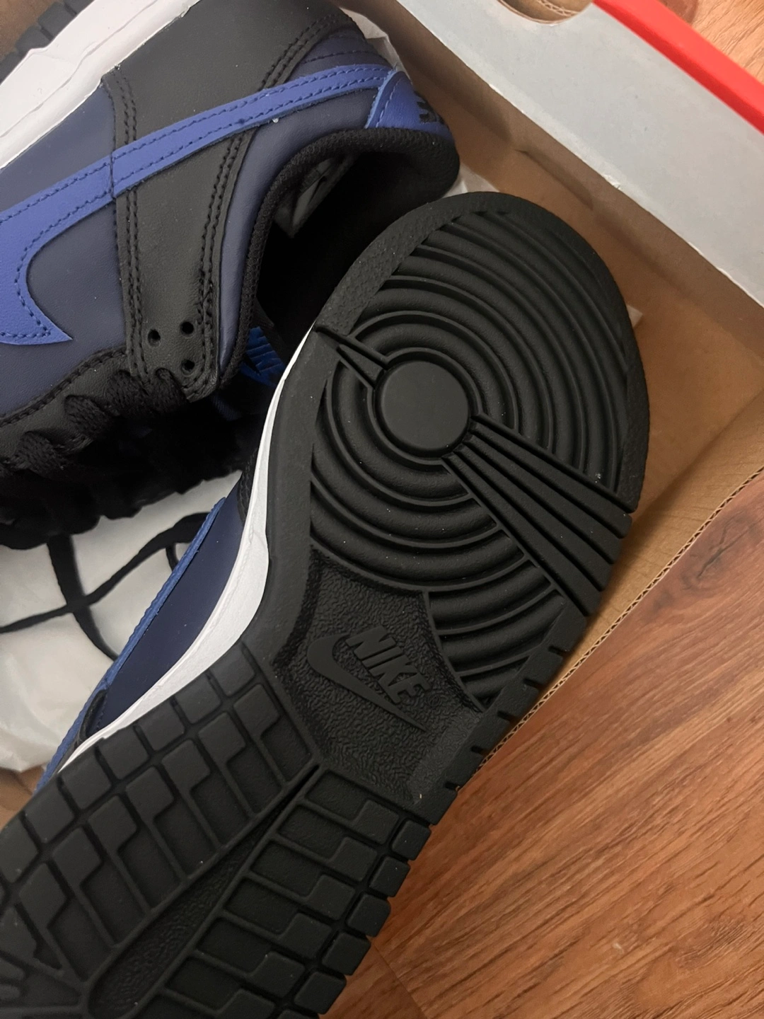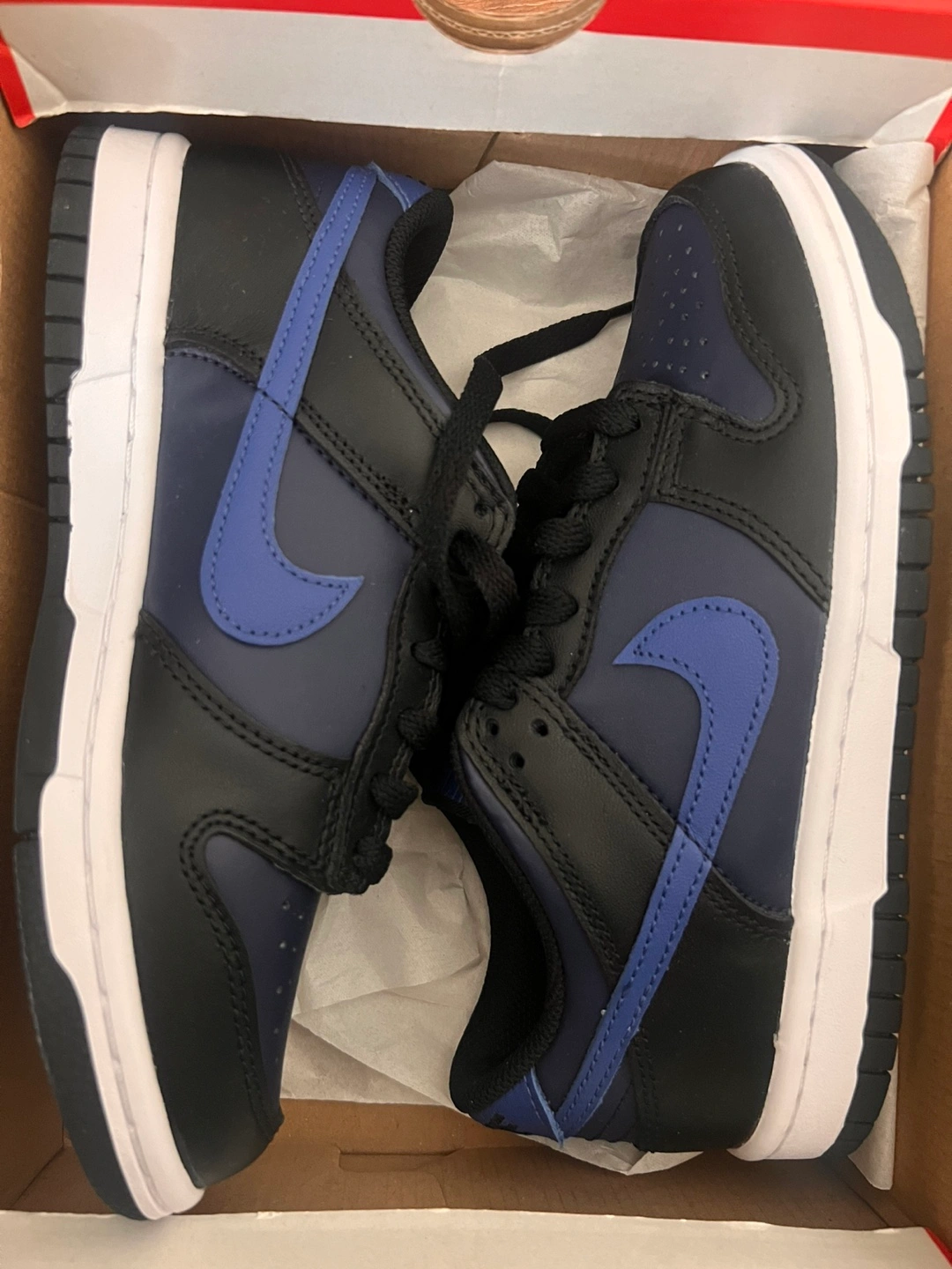 Selling a pair of Nike Dunk Low (GS) in Midnight Navy/Game Royal-Black. These are a youth size 4Y and come with the original box!