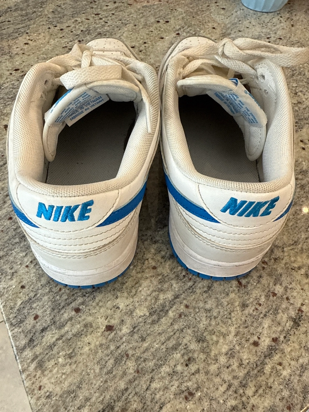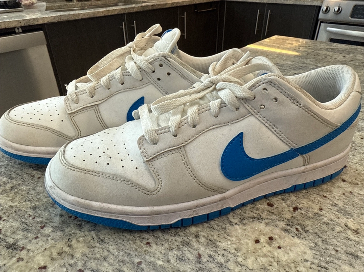 Pre-owned Nike Dunk Low sneakers. White leather upper, blue accents. Size 8.5. Good condition, minor wear.