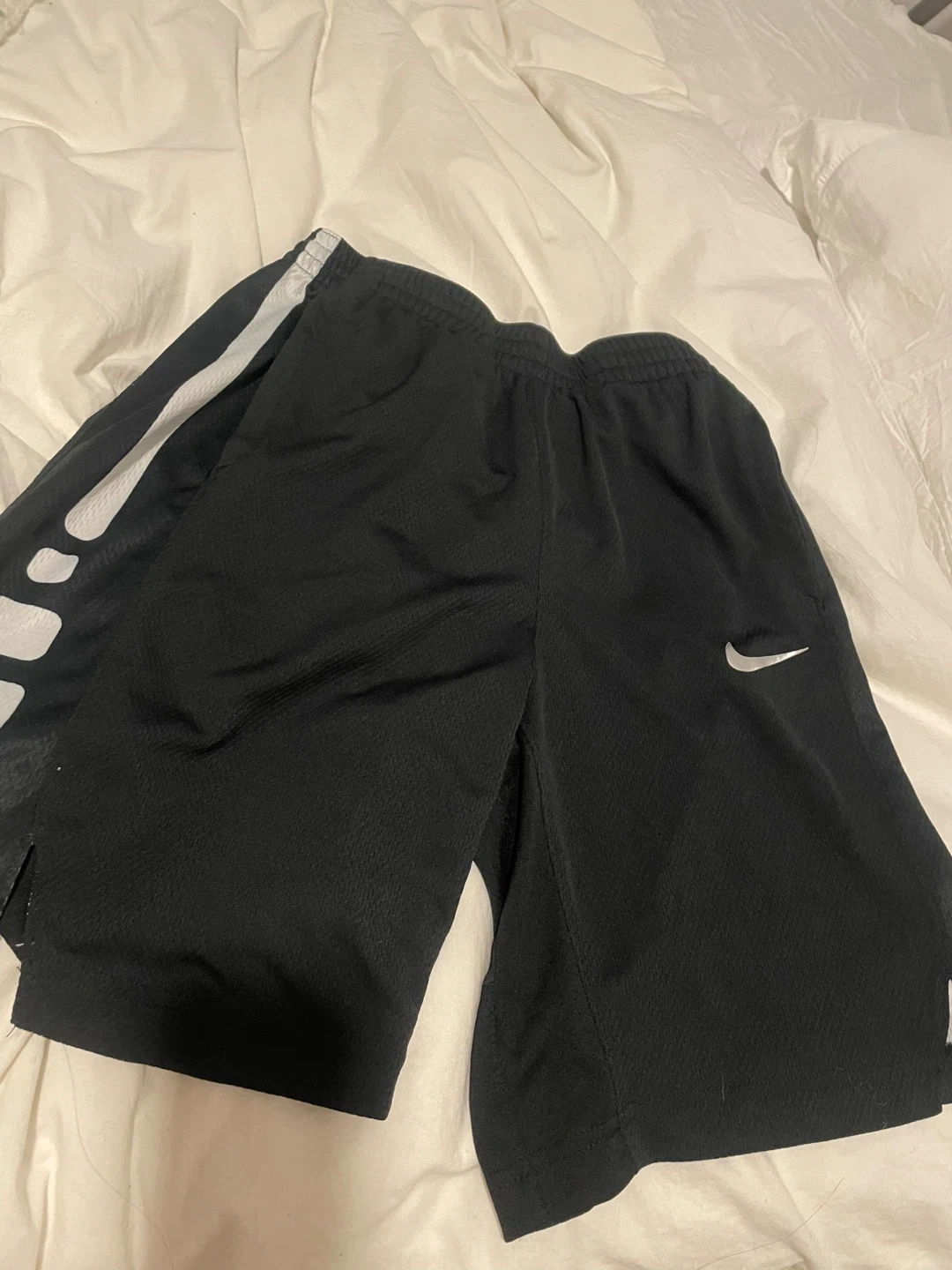 Selling a pair of Nike Elite basketball shorts in black, size large. They're in great shape and ready for the court or just lounging around. The shorts feature the iconic Nike swoosh logo. Feel free to ask any questions!