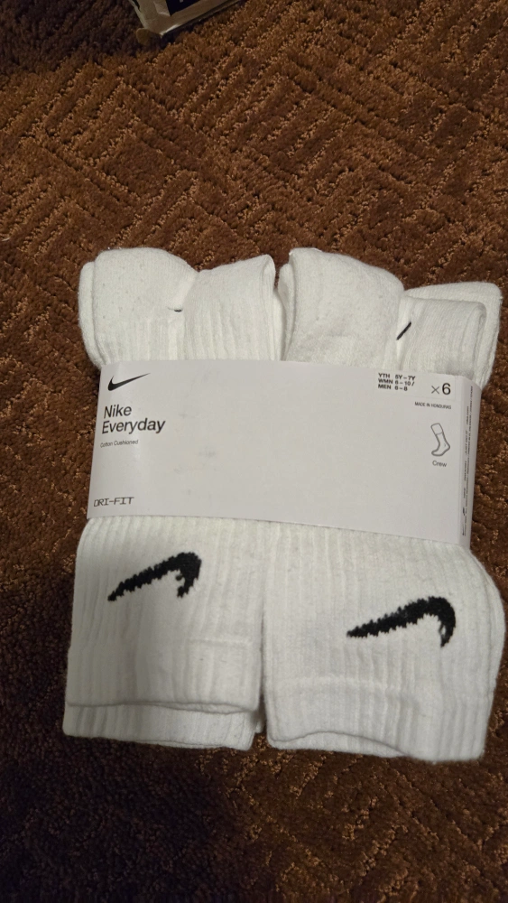 Here's a pack of Nike Everyday cotton cushioned crew socks. There are 6 pairs in the pack. They fit youth sizes 5Y-7Y, women's sizes 6-10, and men's sizes 6-8. They are made of DRI-FIT material