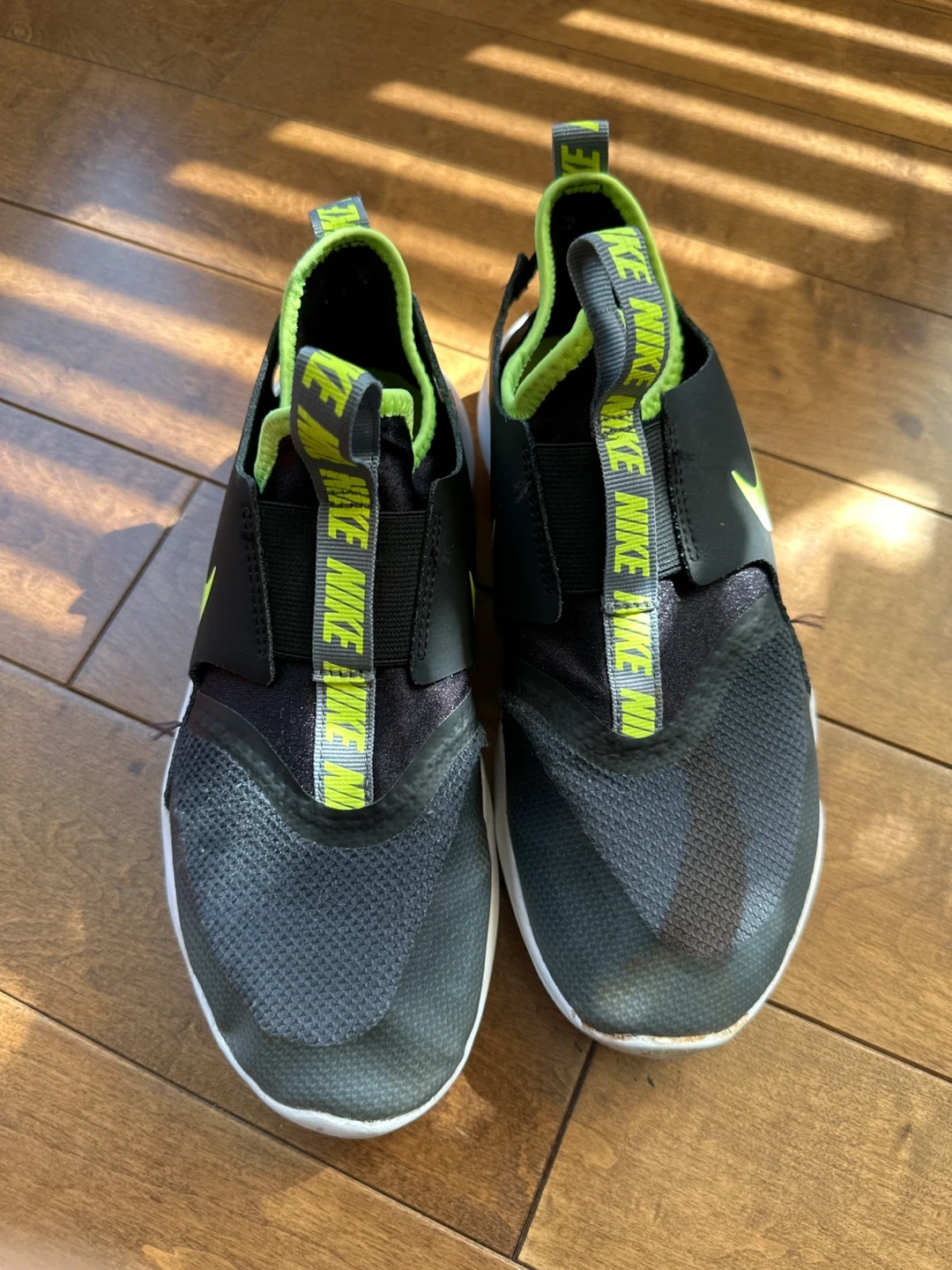 Selling a pair of Nike Flex Advance sneakers in black and green! They're super easy for kids to slip on and off, perfect for active little ones. Some pain stains on the front but lots of life left!