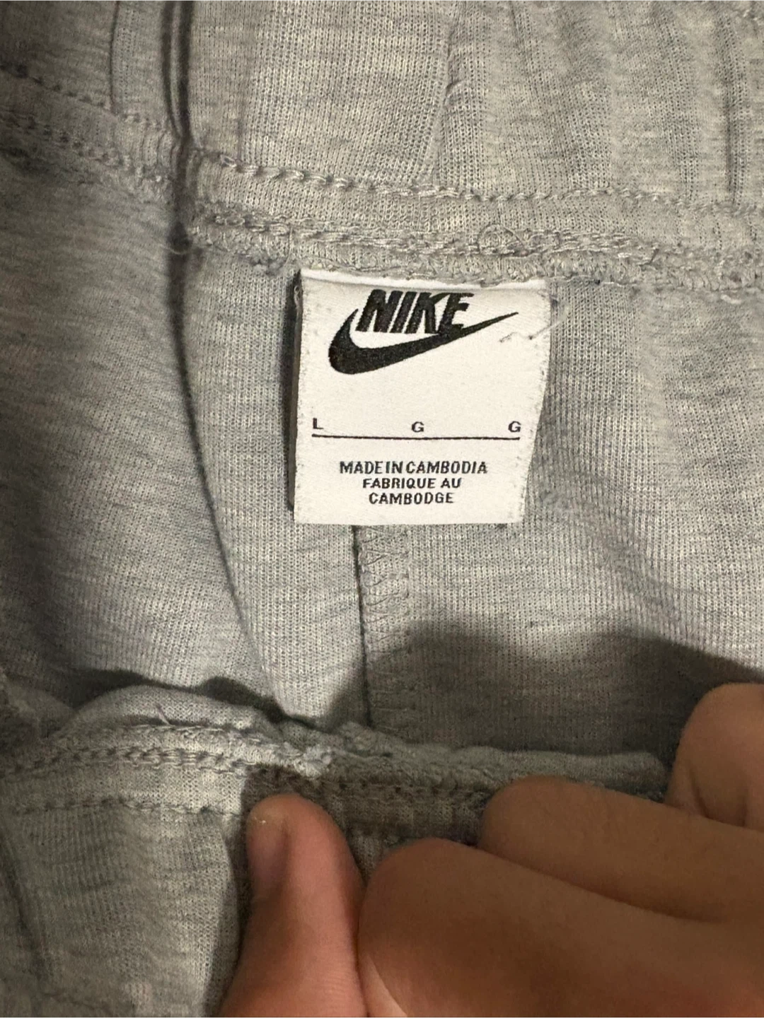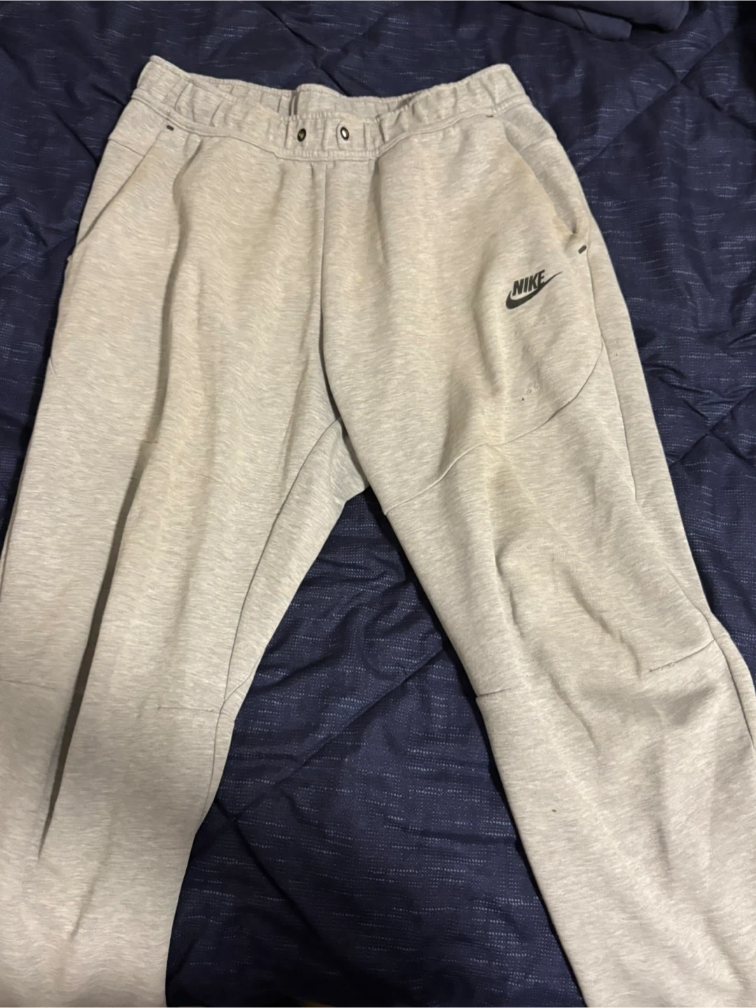 Selling a pair of grey Nike sweatpants in size large. There are some signs of wear, including small holes.