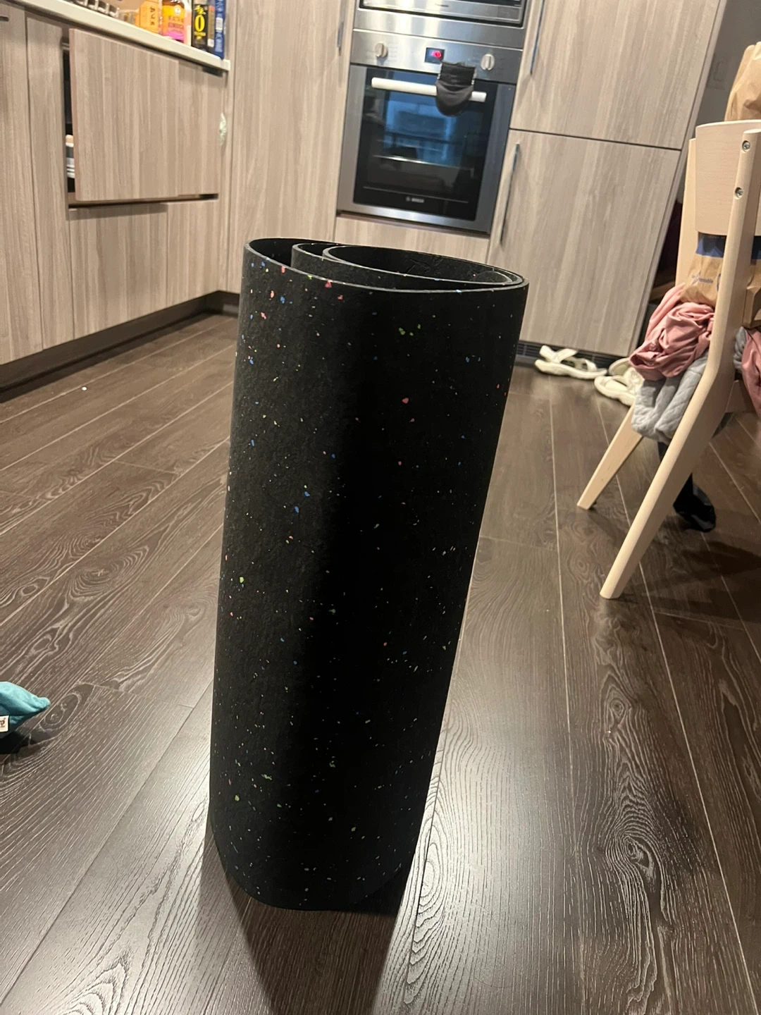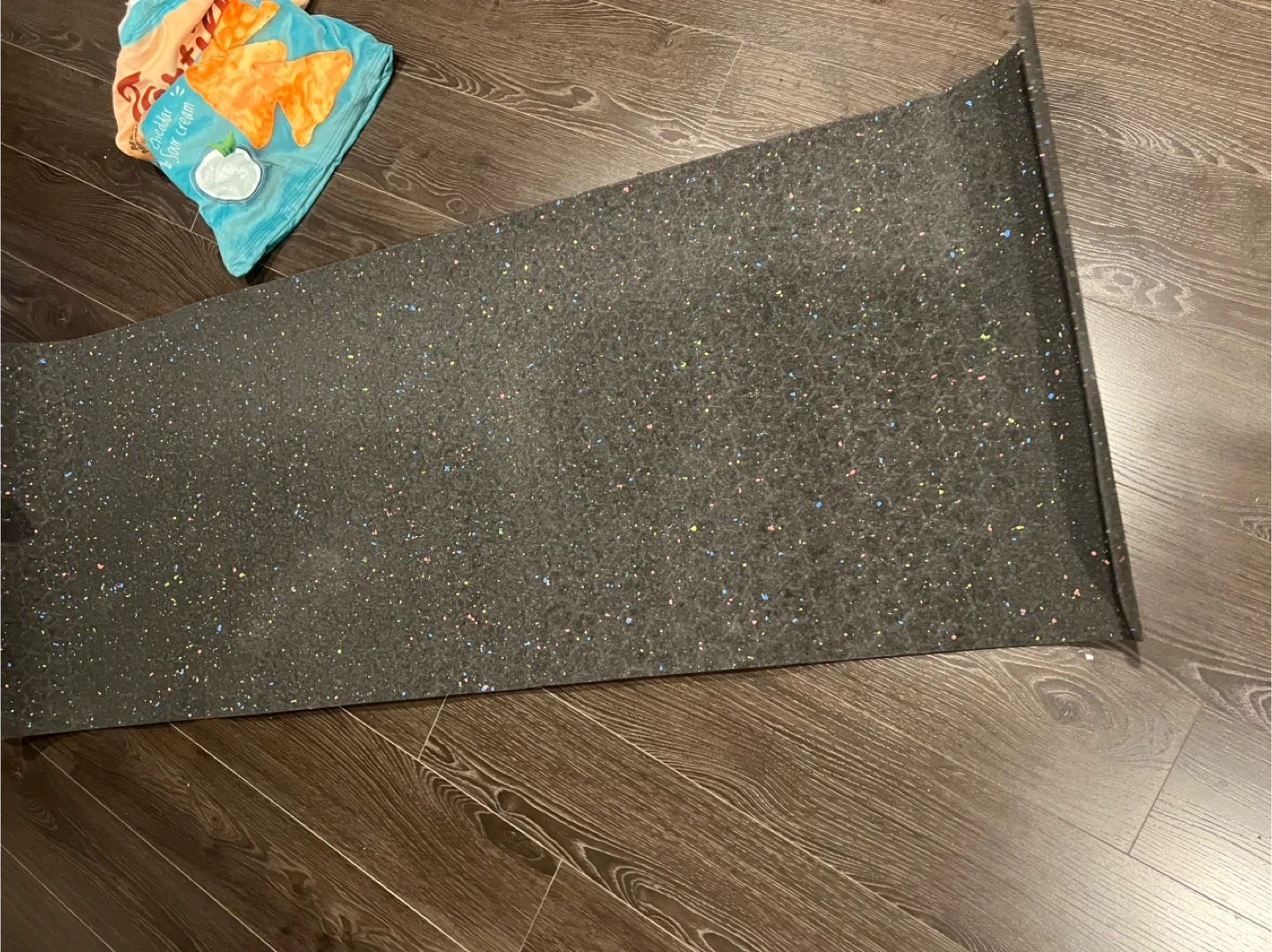 Selling a roll of gym flooring mat. It's black with colourful flecks throughout. Great for home gyms or workout spaces!