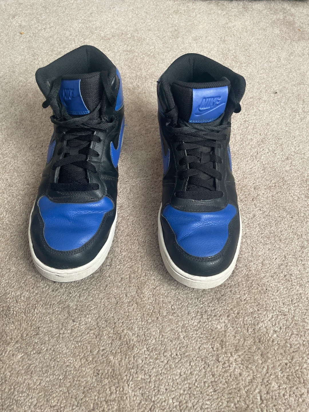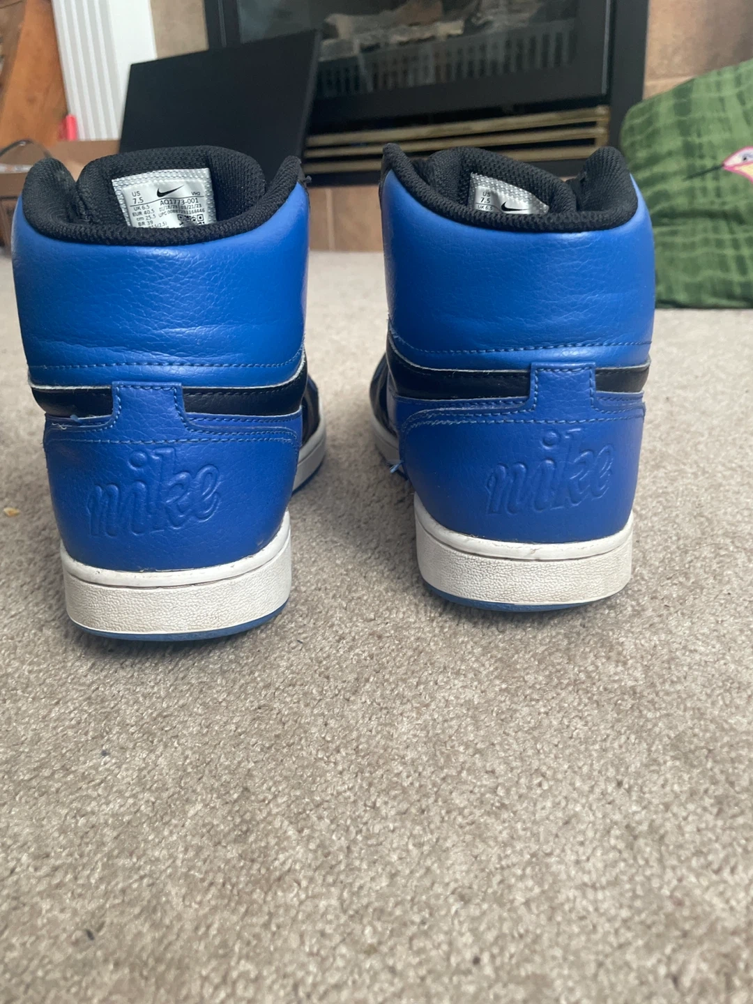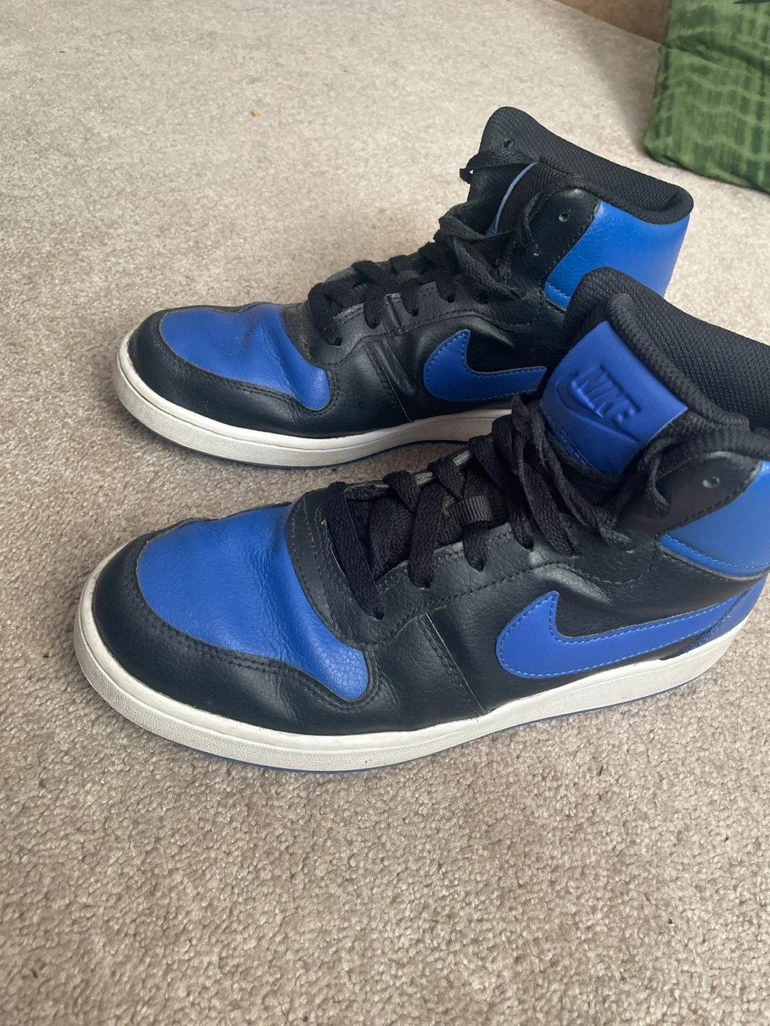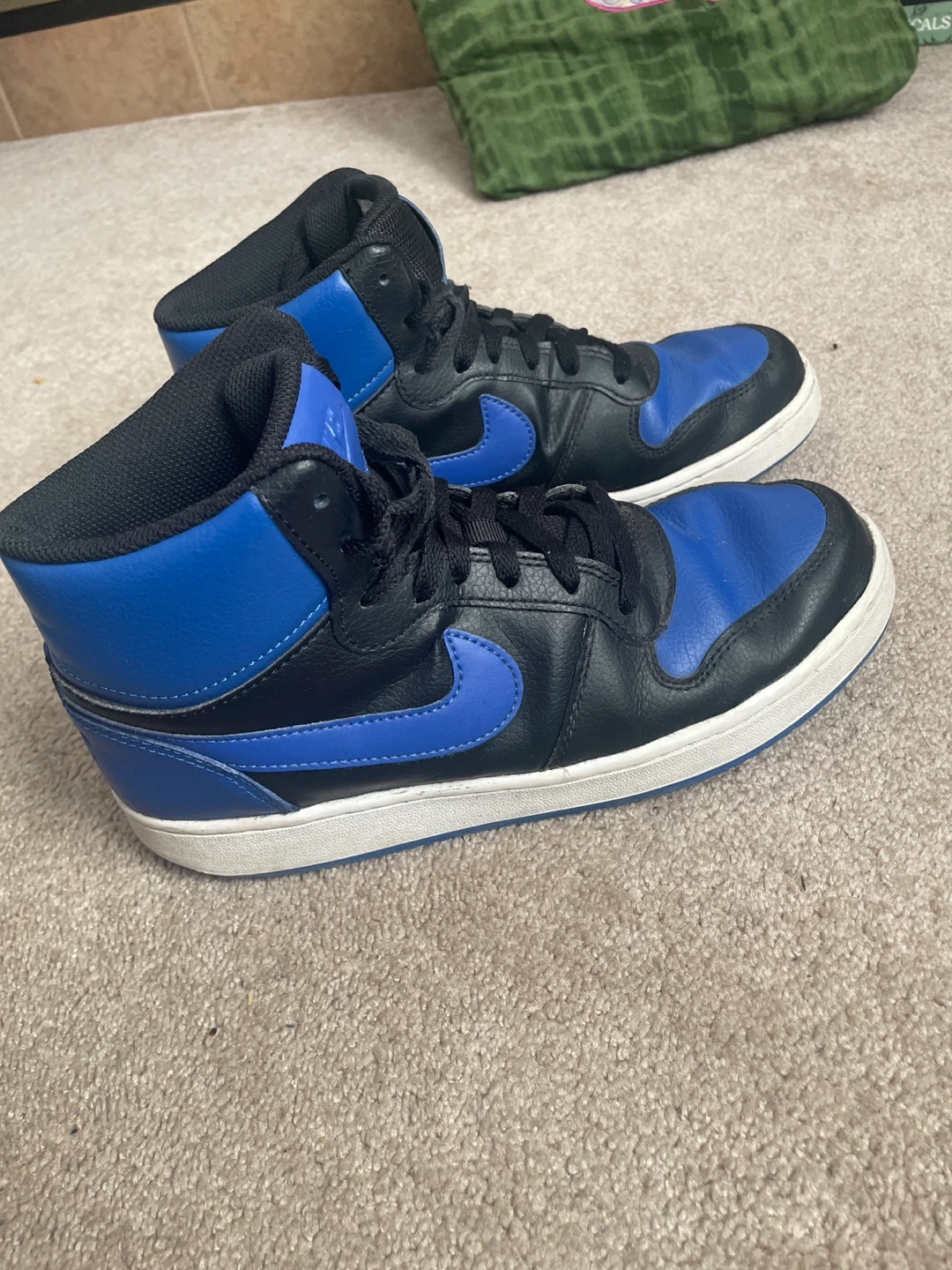 Selling a pair of used Nike high-top sneakers in a cool blue and black colourway! These are in US size 7.5. They have the classic Nike swoosh on the side. Great for casual wear or hitting the court!