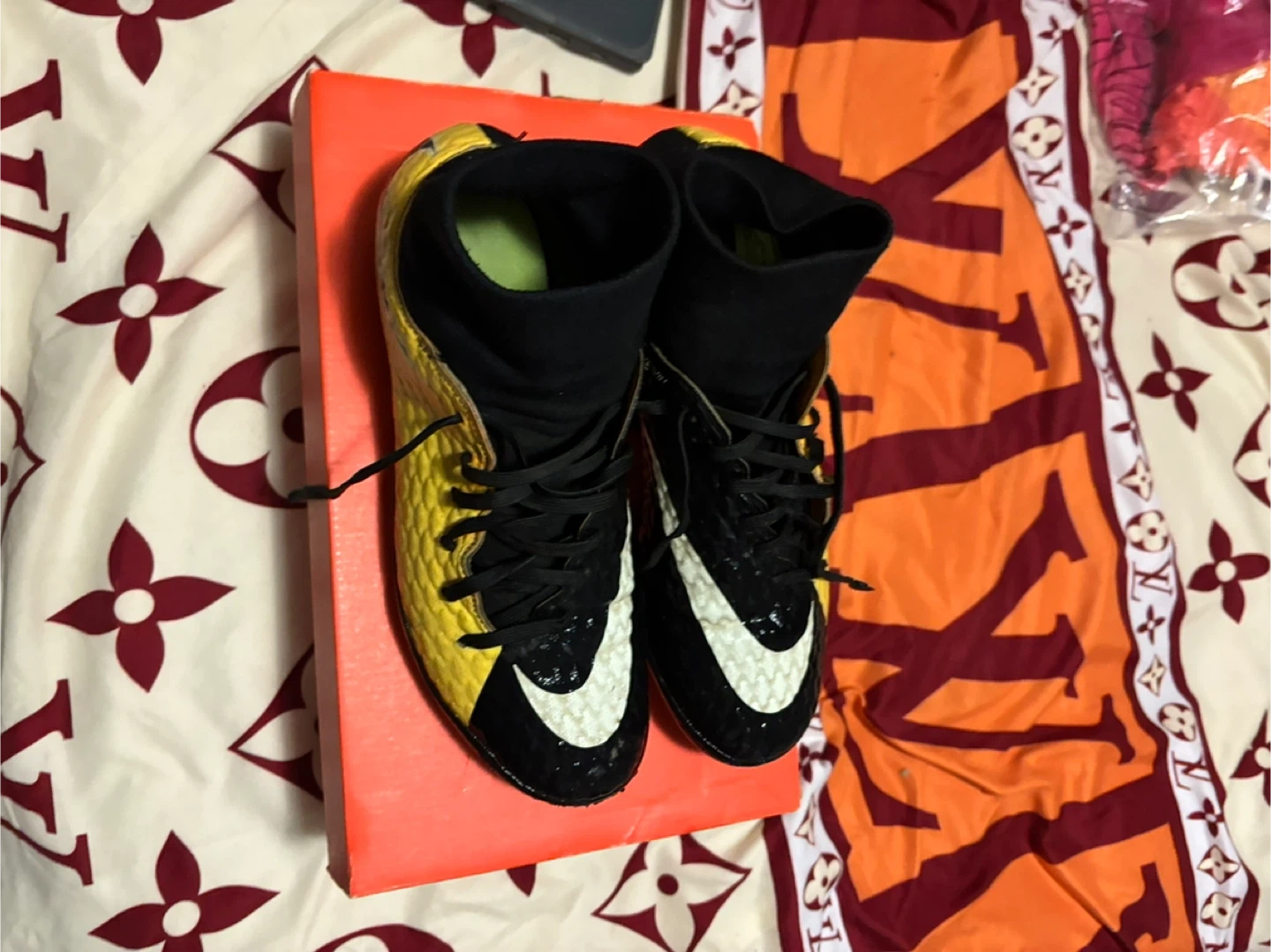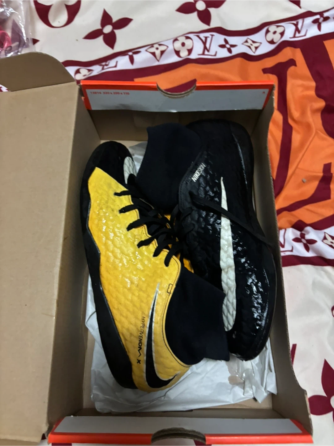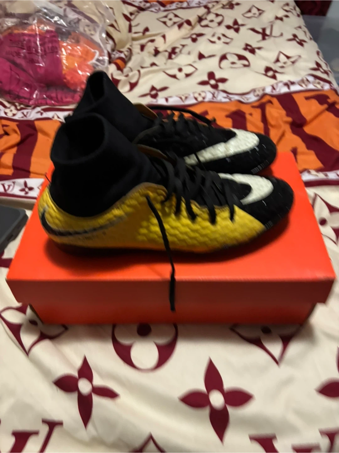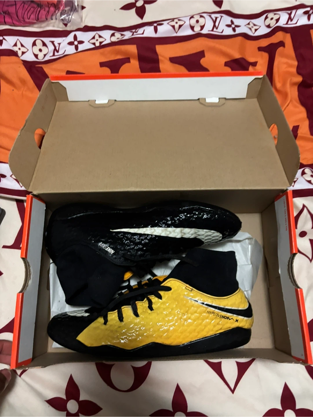 Selling a pair of Nike HypervenomX soccer shoes in size 8. They come in the original box and are in good condition. The shoes feature a yellow and black design with the Nike swoosh. Perfect for soccer players looking for a stylish and functional pair of shoes!