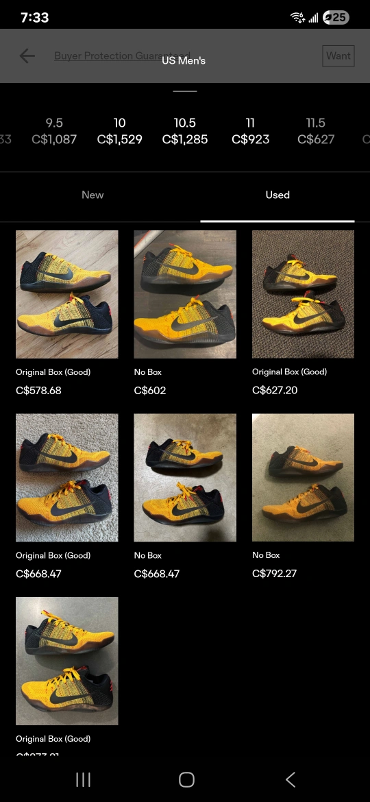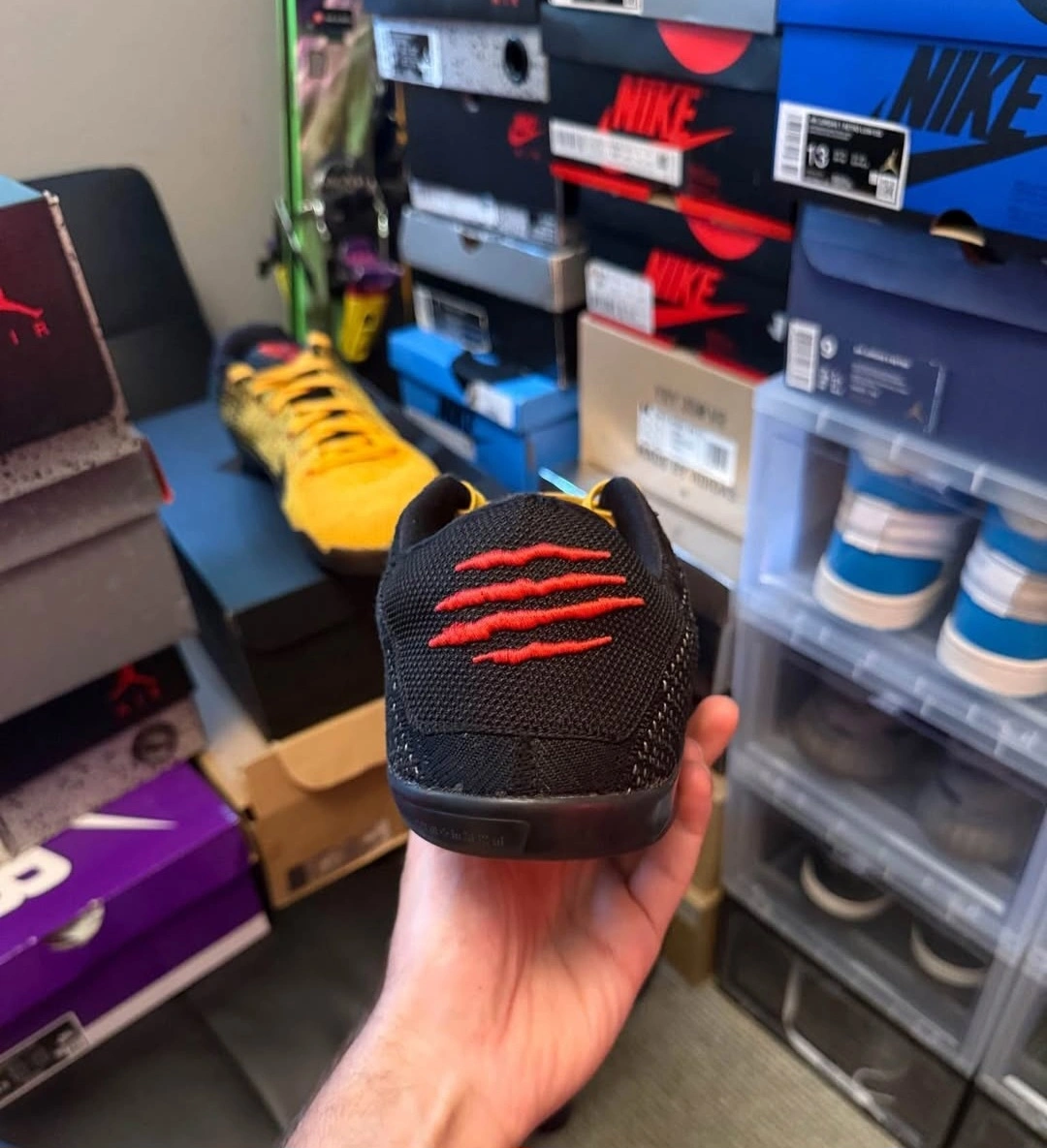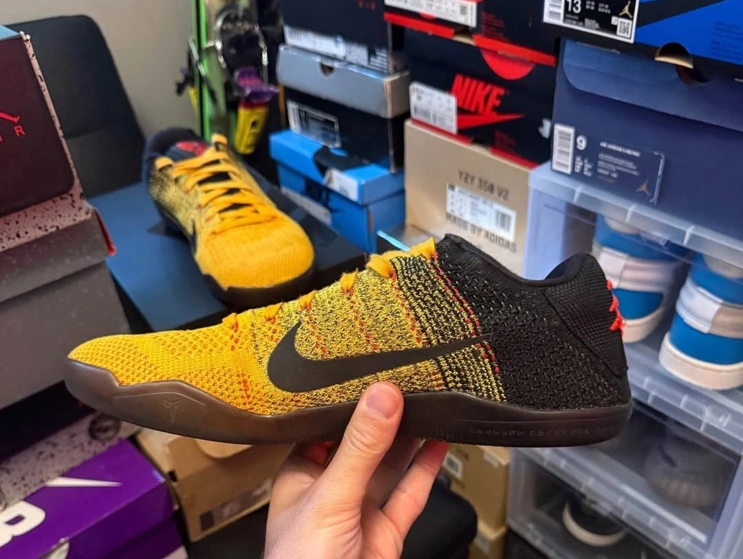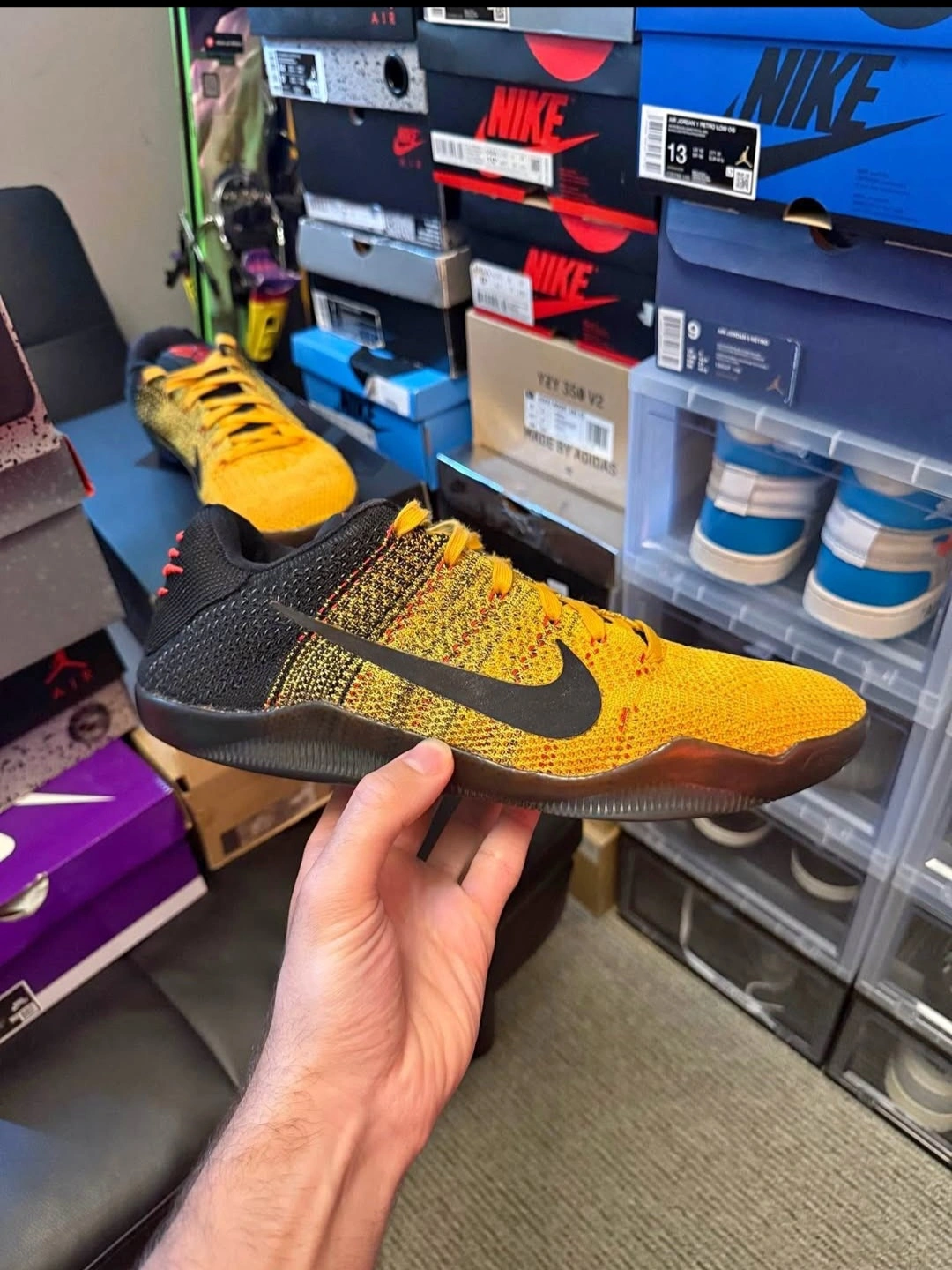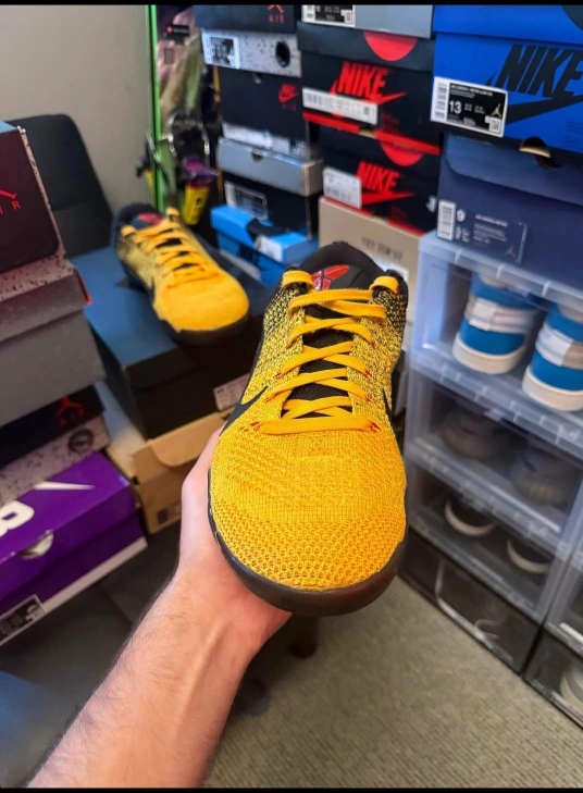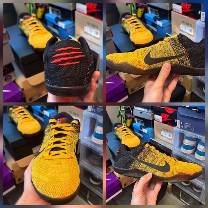 Selling a pair of Nike Kobe 11 EM Low Bruce Lee sneakers. These are a striking yellow and black colourway. The design features a unique pattern and the iconic Nike swoosh. They are in good condition and ready for a new home!