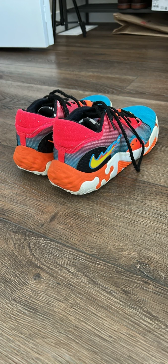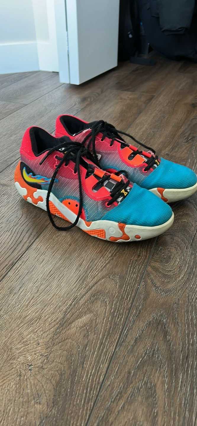 Selling a pair of Nike PG 6 basketball shoes. They're in good condition and ready for the court! They feature a unique colourway with red, orange, and blue accents. Size 8