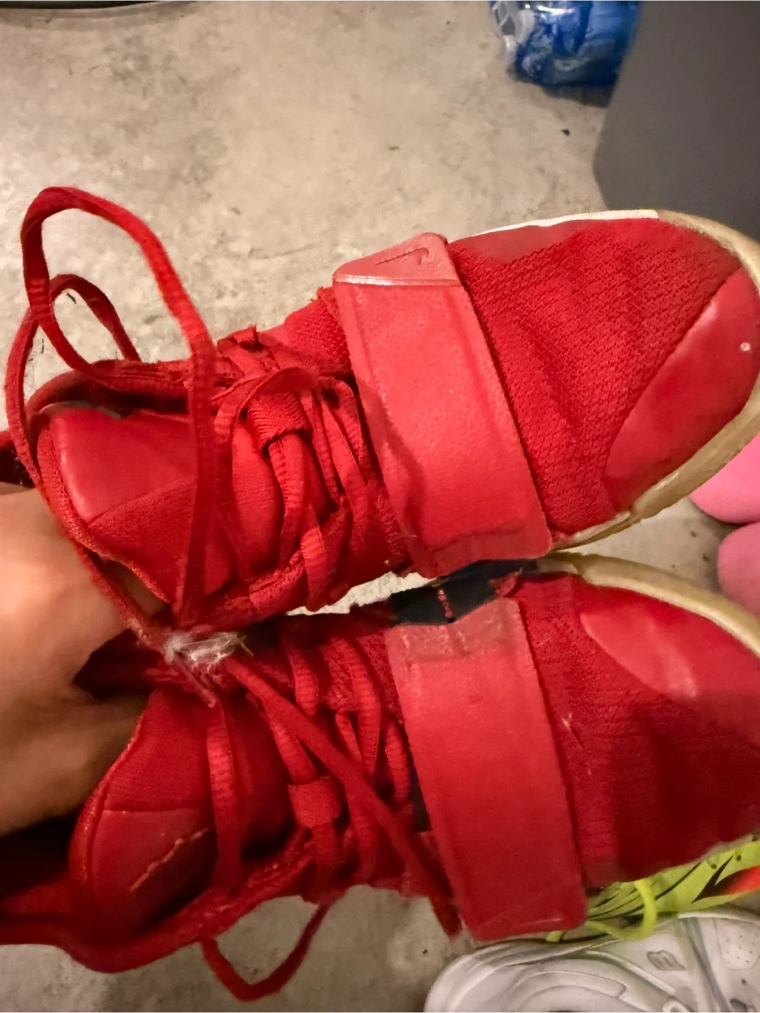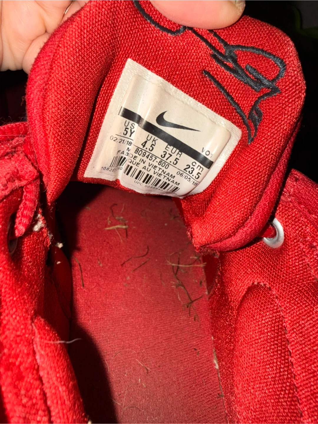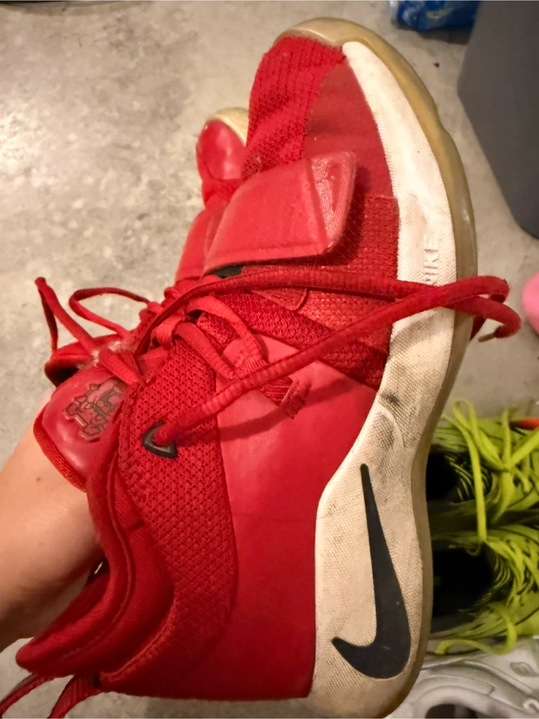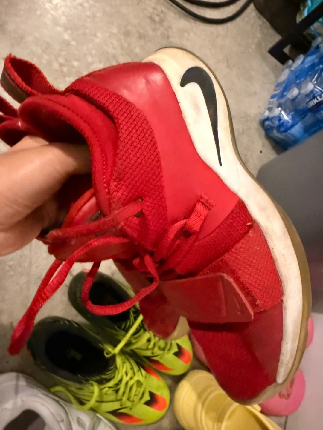Selling a pair of used Nike PG2 basketball shoes in red. They are a youth size 5Y, which is equivalent to UK 4.5 or EUR 37.5. Great for young athletes!