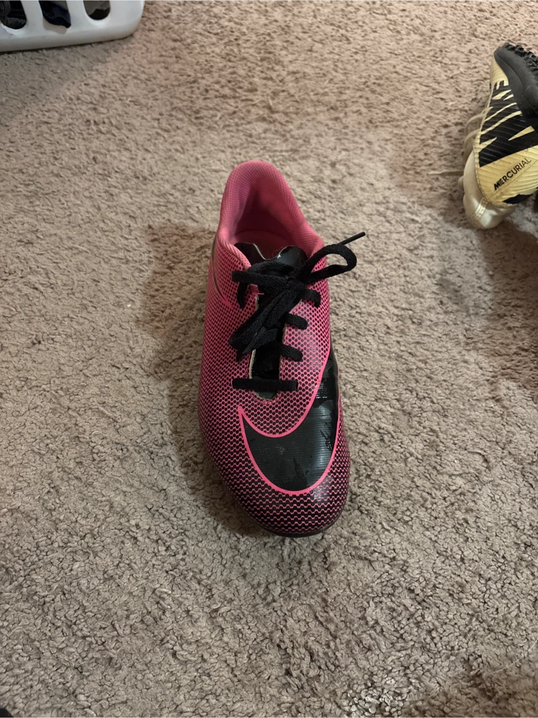Selling a pair of Nike soccer cleats in pink and black. They look like they've been used, but still have lots of life left in them for the field!