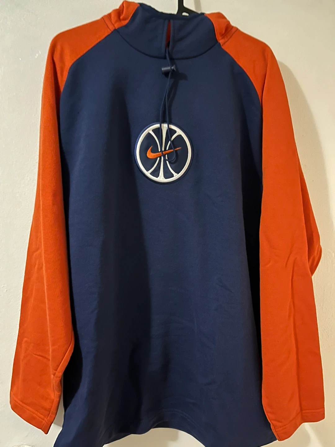 Selling a Nike pullover hoodie with a unique design! It features a navy blue body with vibrant orange sleeves.