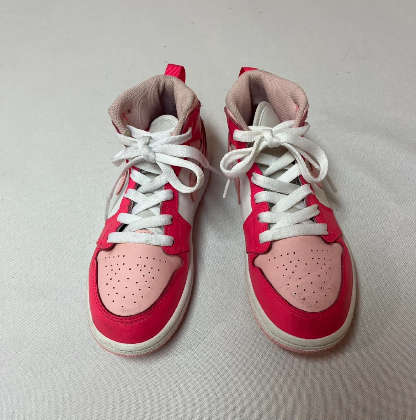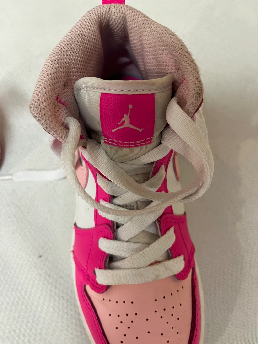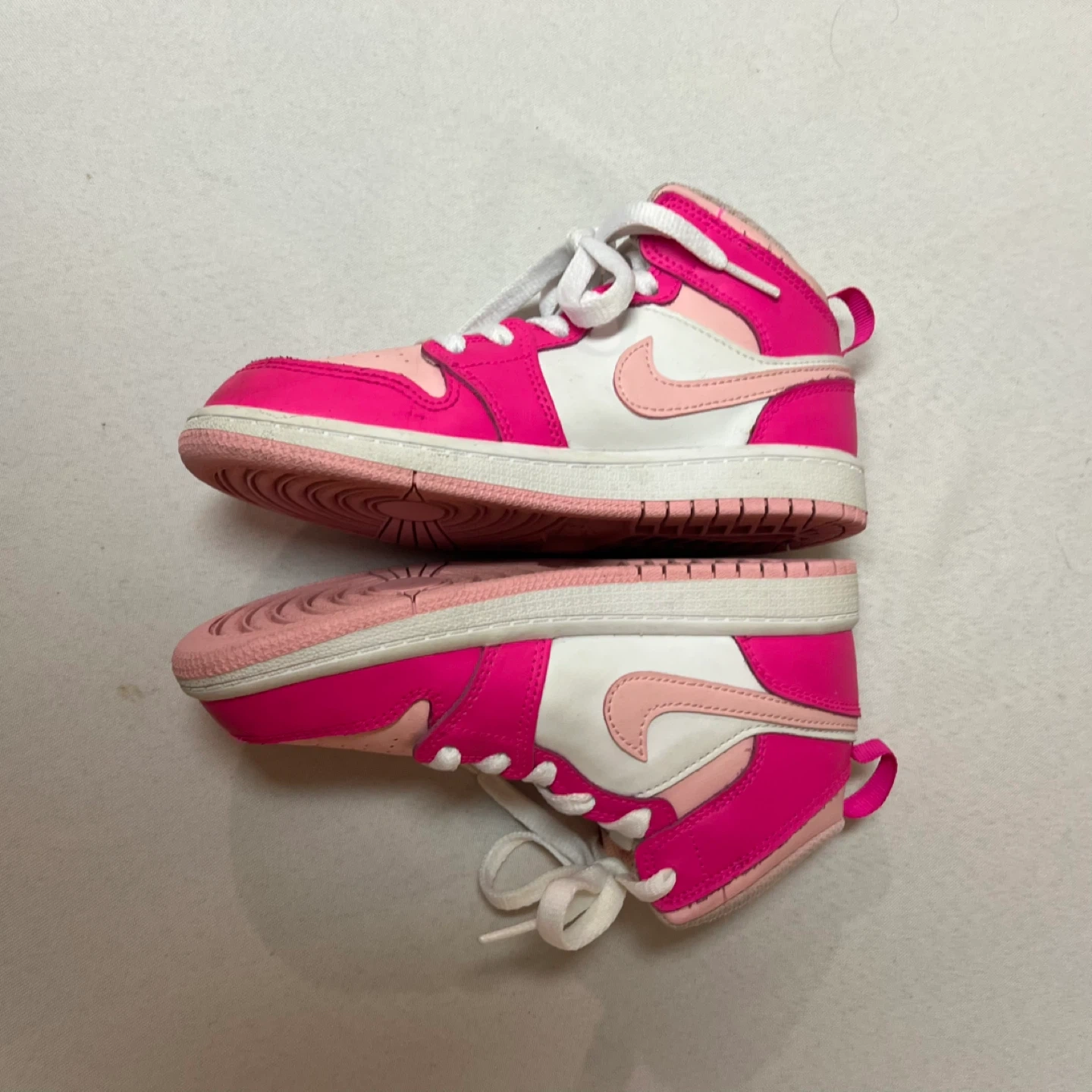 Rare Pink Kids Shoes Make: Nike Model: Air Jordan 1 - Mid - Fierce Pink Style #: FD8781-116 Colours: White/Fierce Pink/Medium Soft Pink Size: 1 Y Condition: Used 1x Asking: $50 Pick pink for the win! This pair pops to life with a bright mix of rosy hues. All the classic Jordan comforts are there too: foam in the sole for a cushioned step, and that sturdy rubber cupsole for comfort. Benefits * Leather offers durability and structure. * Solid rubber outsoles add traction for little feet. Product Details * Classic laces * Wings logo stamped on the collar * Stitched-down Swoosh logo * Jumpman design on the tongue Midtown Toronto Location