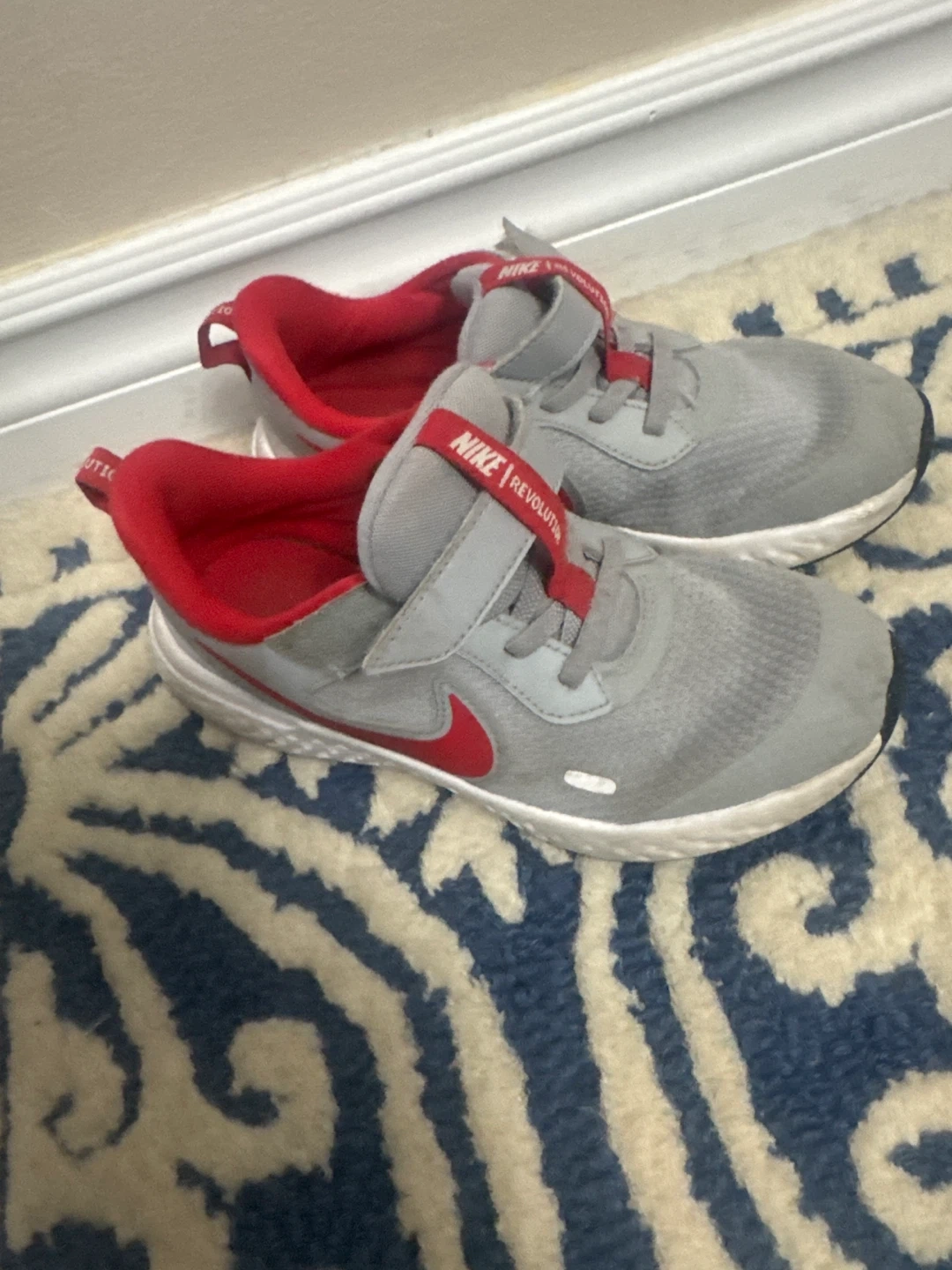 Selling a pair of Nike Revolution 5 kids' runners in size 2Y. They're grey with red accents and in great shape for your little one!