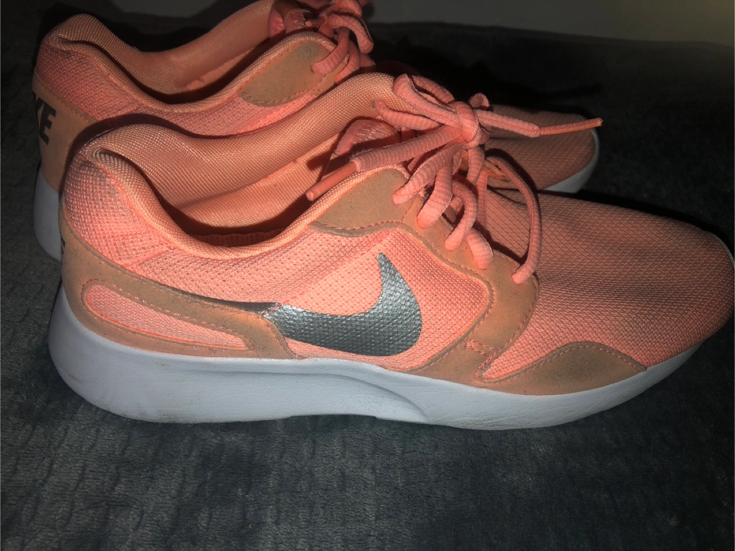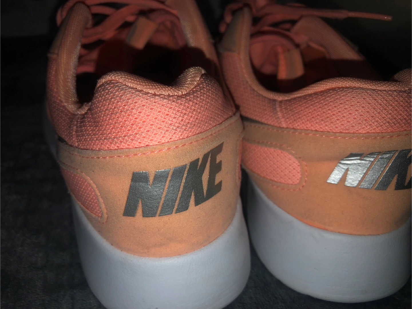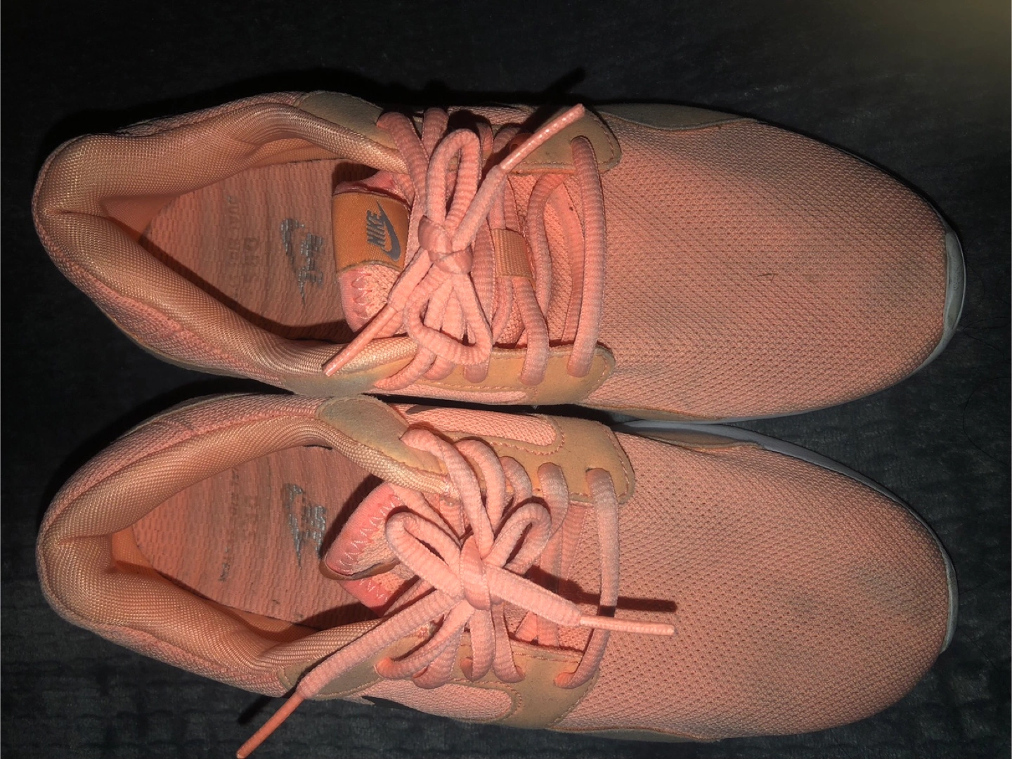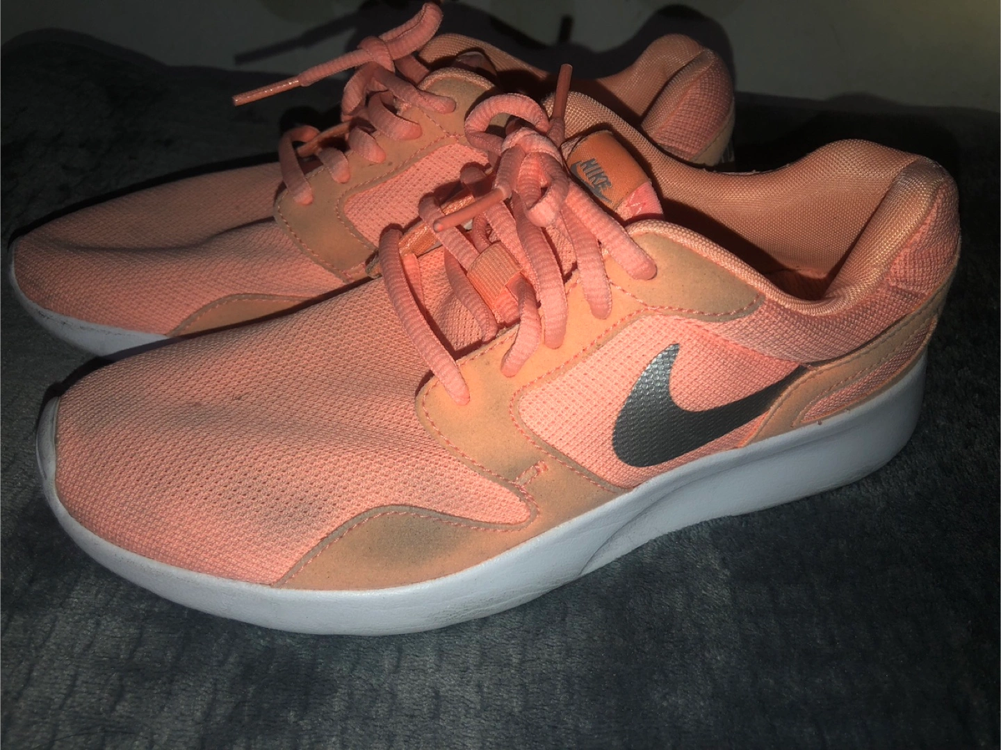 Nike running shoes in a peach pink colour. They have been worn and show some signs of wear, as shown. Perfect for back to school gum shoes! Women’s Size 7 US