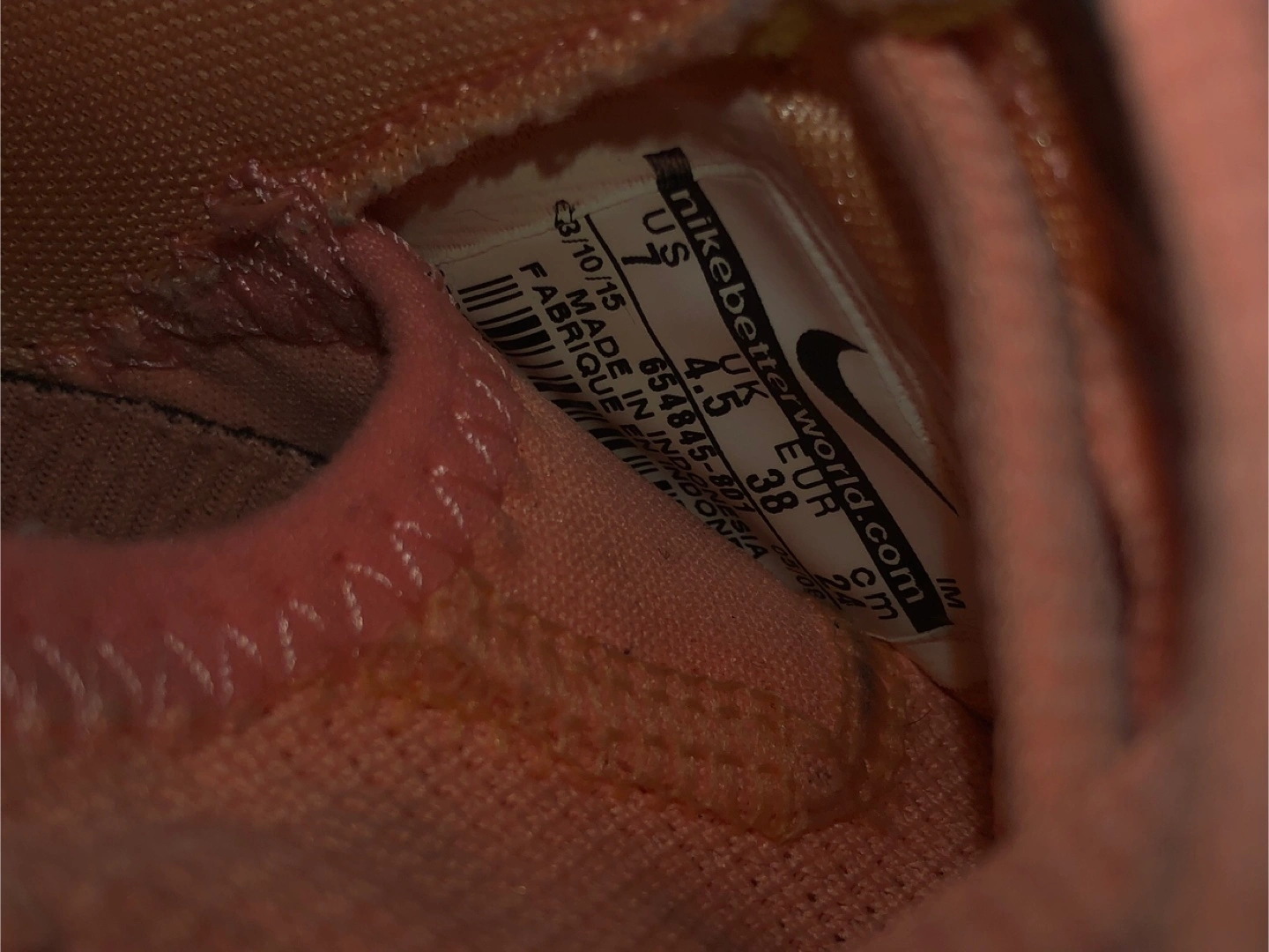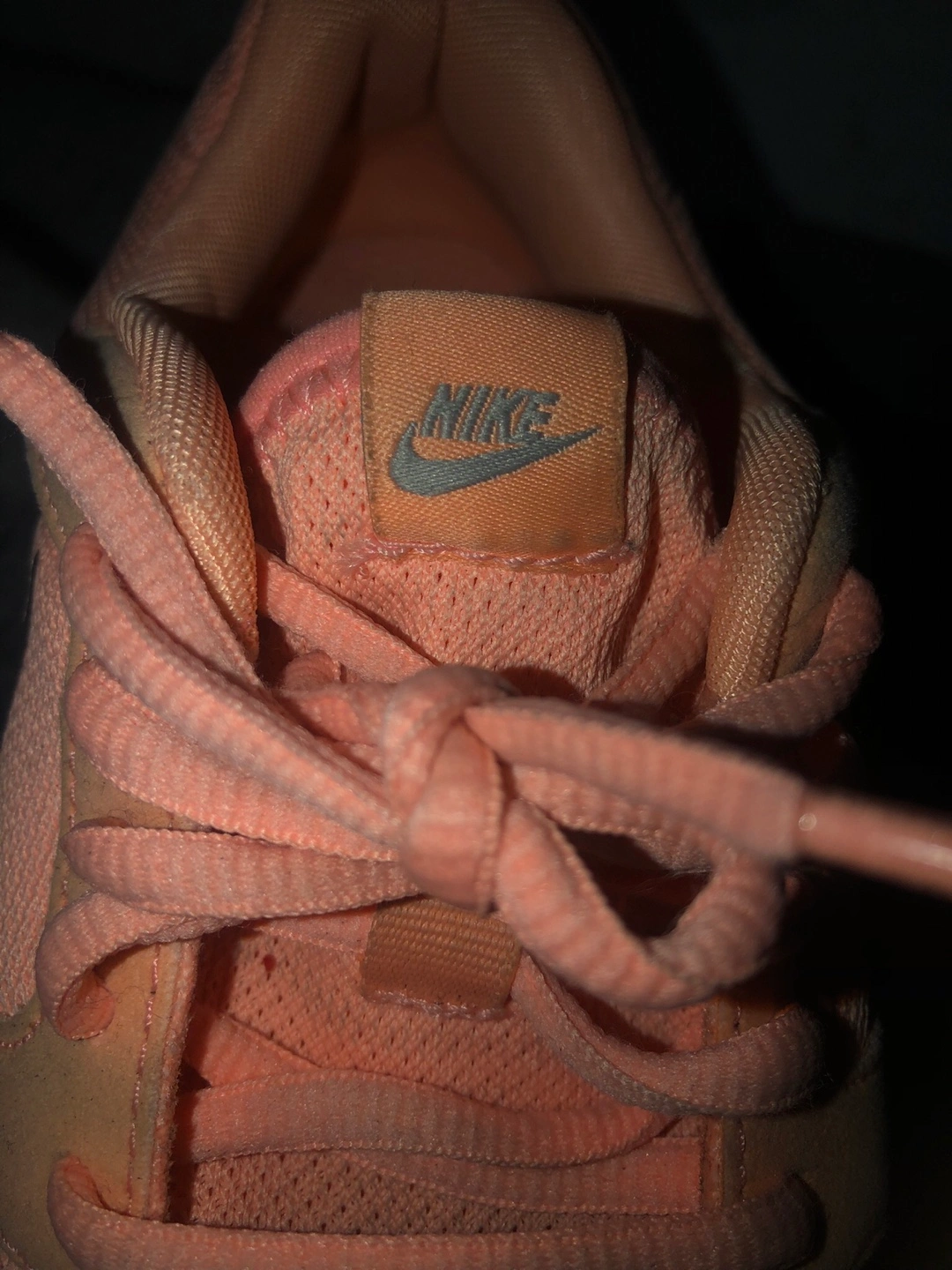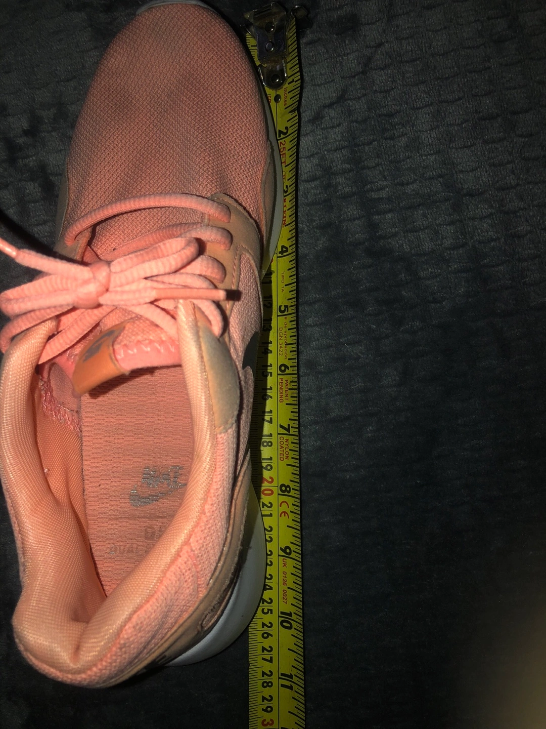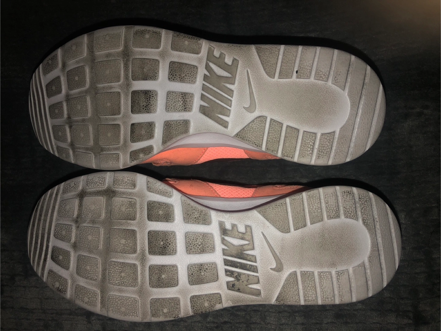 Nike running shoes in a peach pink colour. They have been worn and show some signs of wear, as shown. Perfect for back to school gum shoes! Women’s Size 7 US