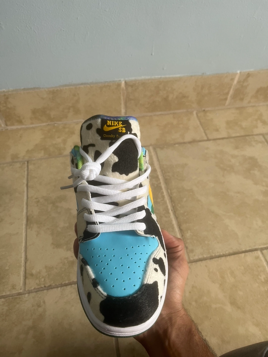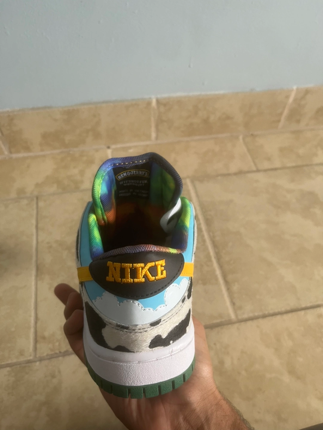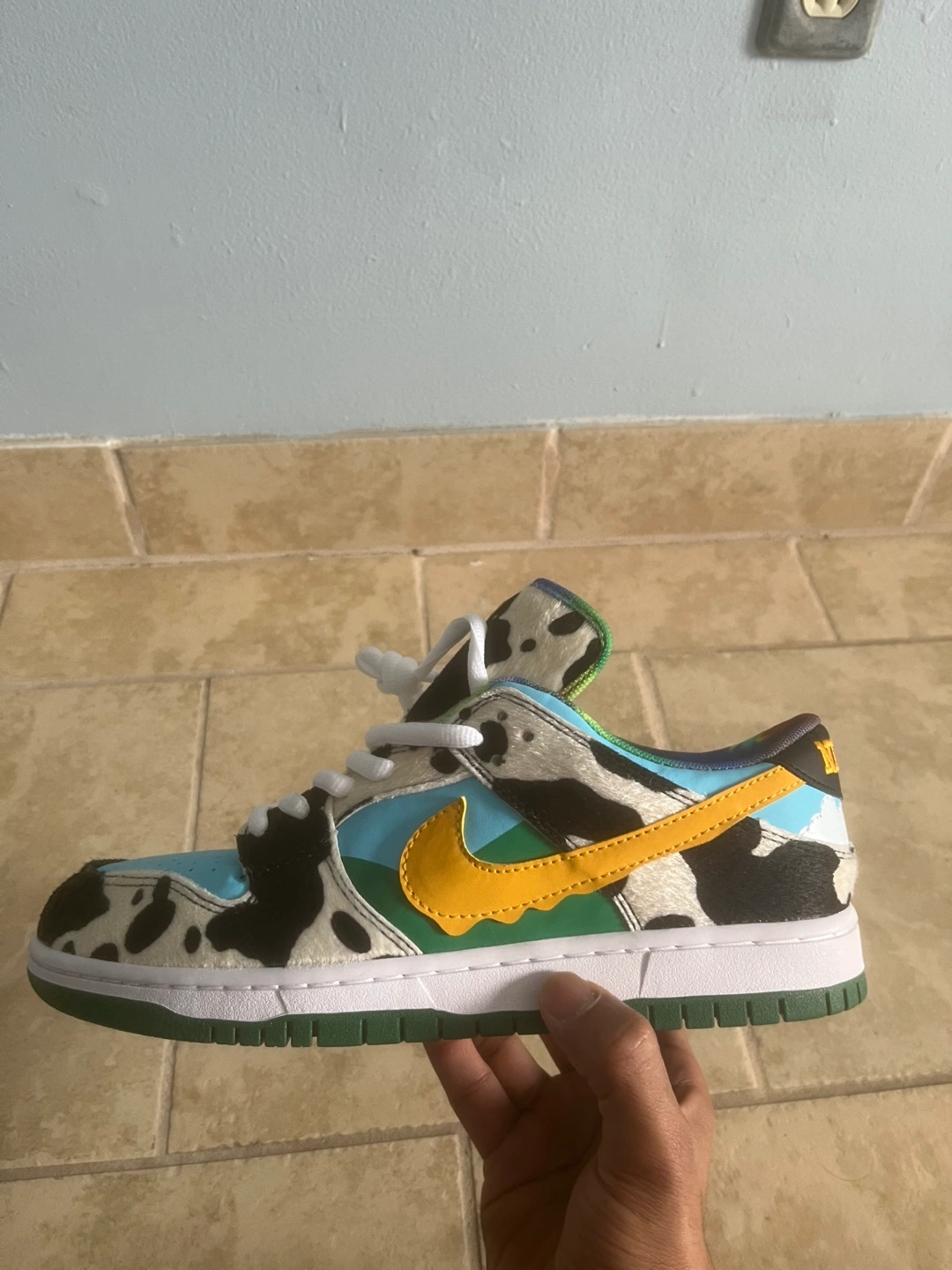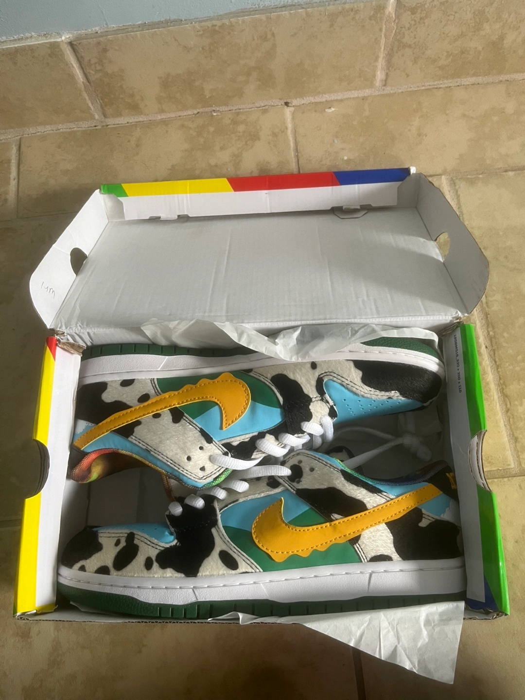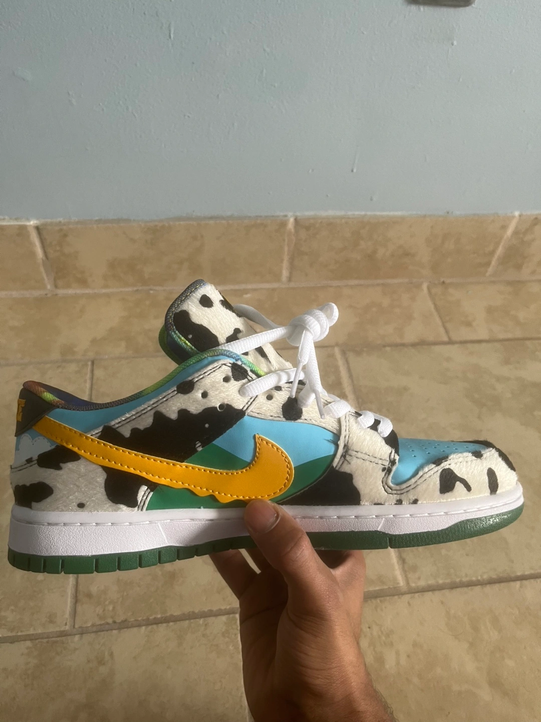 Selling a pair of Nike SB Dunk Low Ben & Jerry's Chunky Dunky sneakers! These are in great condition and come with the original box. The unique design features cow print, blue sky, and a melting swoosh. A fun addition to any sneaker collection!