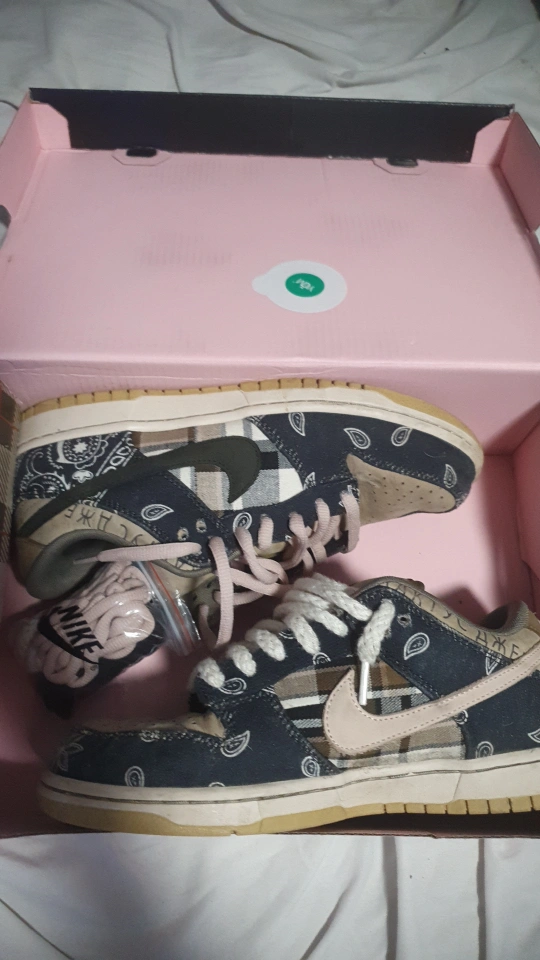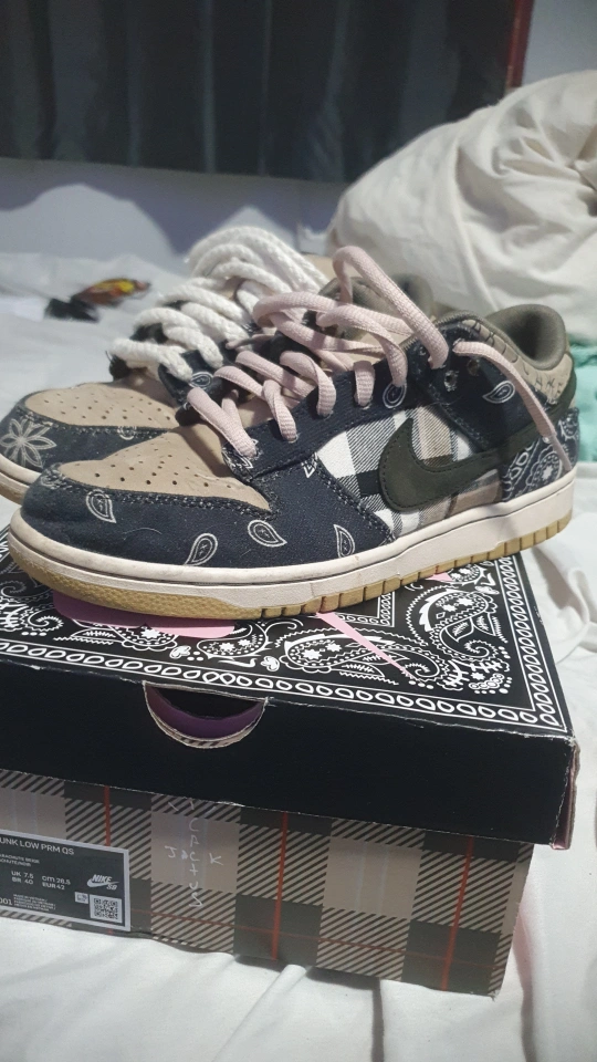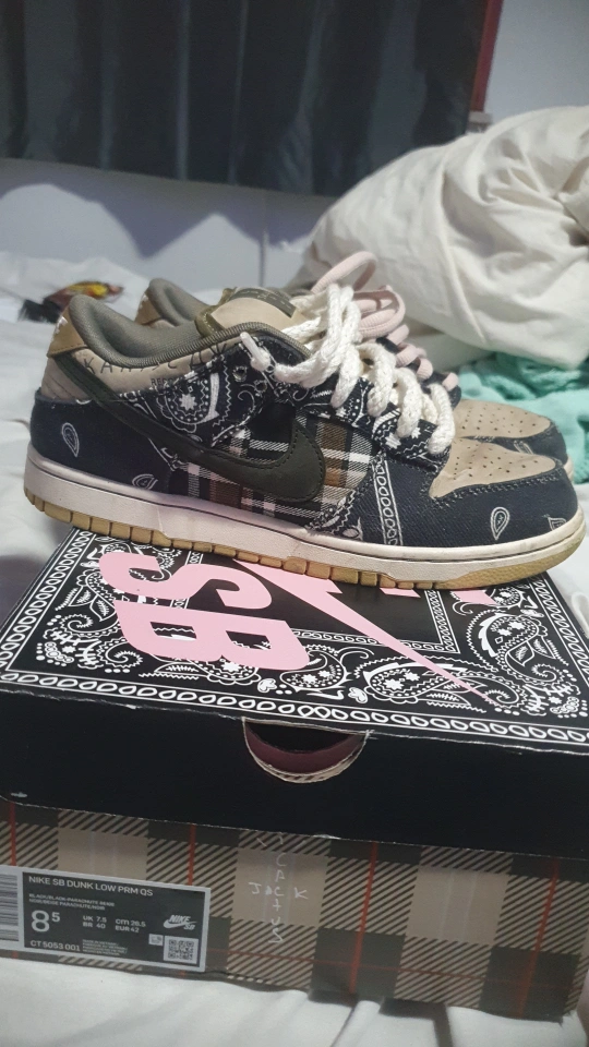 Selling a pair of Nike SB Dunk Low Travis Scott shoes in size 8.5 US. They come with the original box and extra laces!