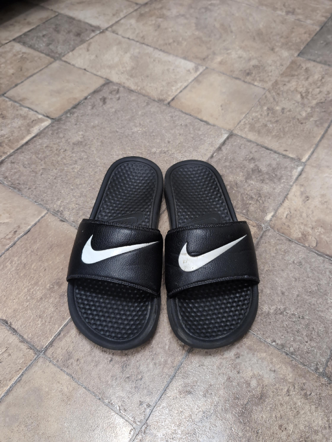 Selling a pair of Nike slides! They're black with a white Nike swoosh. Size 8 US.