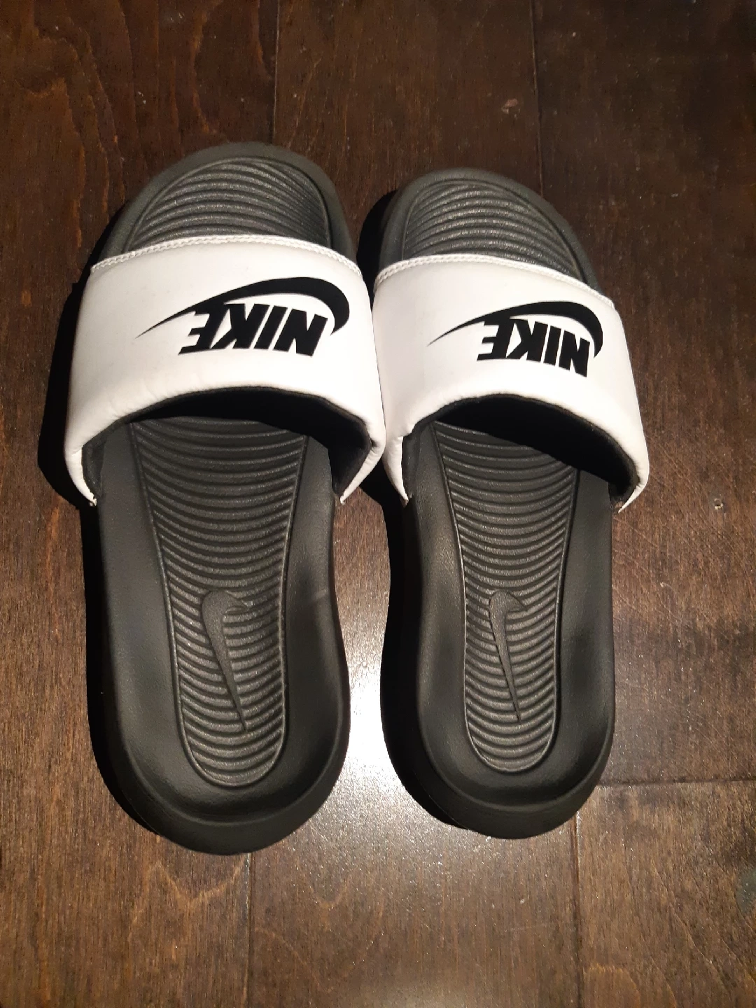 Selling a pair of Nike slides in a classic white and black colourway! These are super comfy and perfect for everyday wear and ready for a new home.