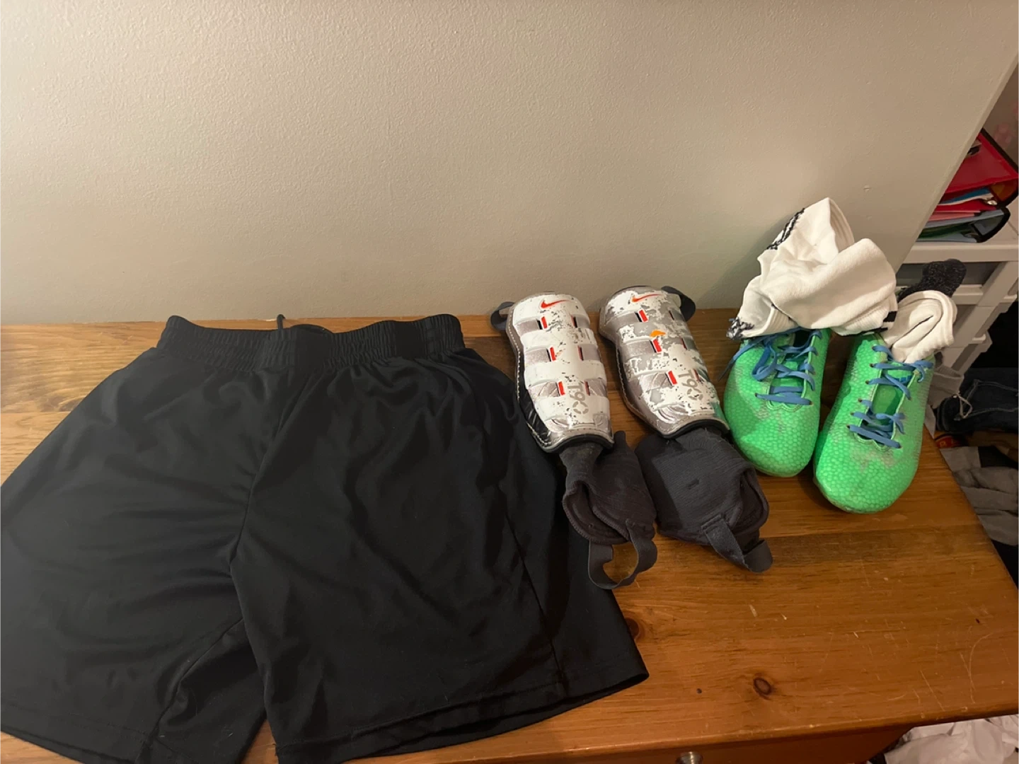 Selling a set of Nike soccer gear! Includes a pair of black shorts, Nike shin guards, and bright green cleats. Perfect for a New soccer player Cleats are 7 1/2 Shorts are a size small