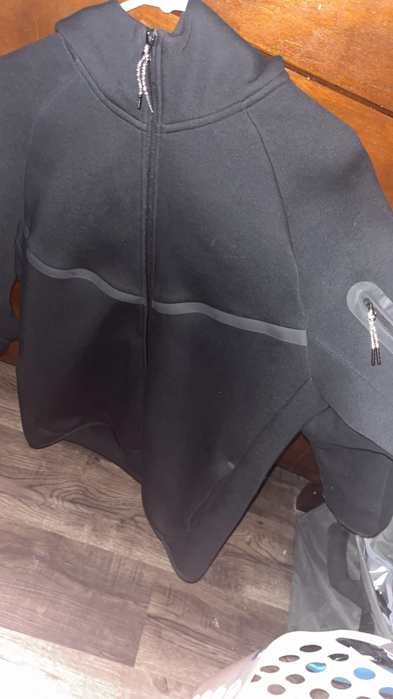 Selling a Nike Tech Fleece jacket in black. It's in great condition and perfect for layering or wearing on its own. The material is soft and comfortable, perfect for everyday wear TRADES OR CASH