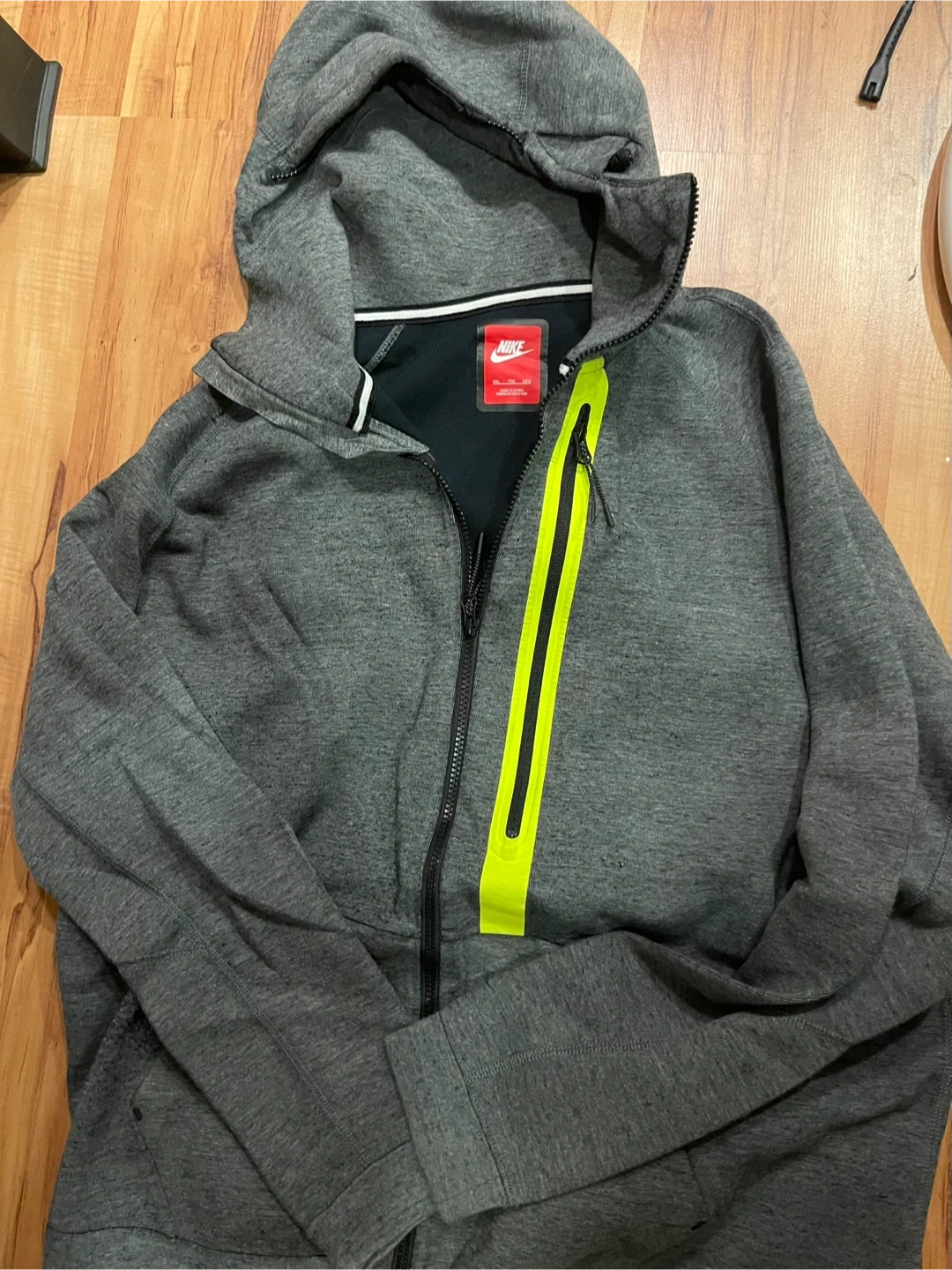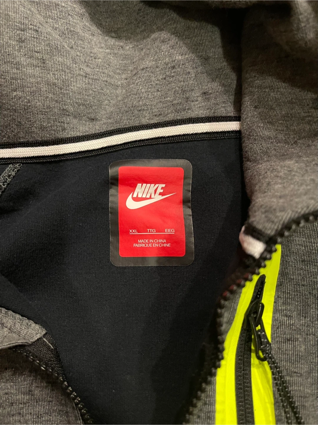 Selling a Nike Tech Fleece hoodie in size XXL. It's in great condition and has a cool grey colour with a neon yellow accent on the zipper. Perfect for staying warm and stylish!