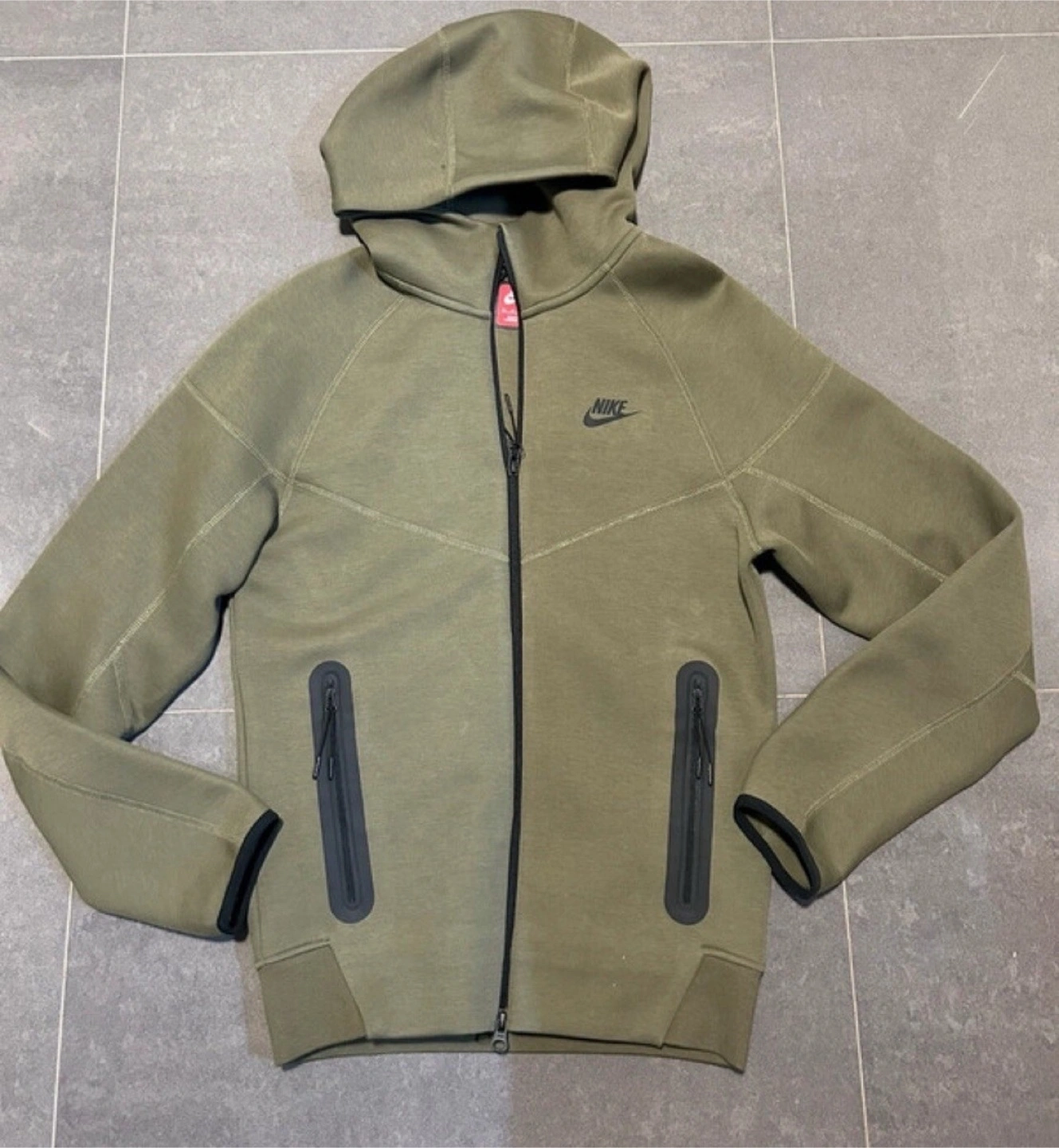 Selling a Nike Tech Fleece hoodie in olive green. It's in great condition and super comfy for everyday wear. The material is soft and warm, perfect for those cooler days. It features a full zip and a hood for extra coverage. The design is sleek and modern, with a slim fit.