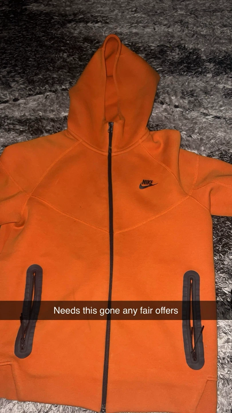 Selling an orange Nike Tech Fleece hoodie. It has a full zipper and the Nike logo on the chest. Perfect for layering or wearing on its own!